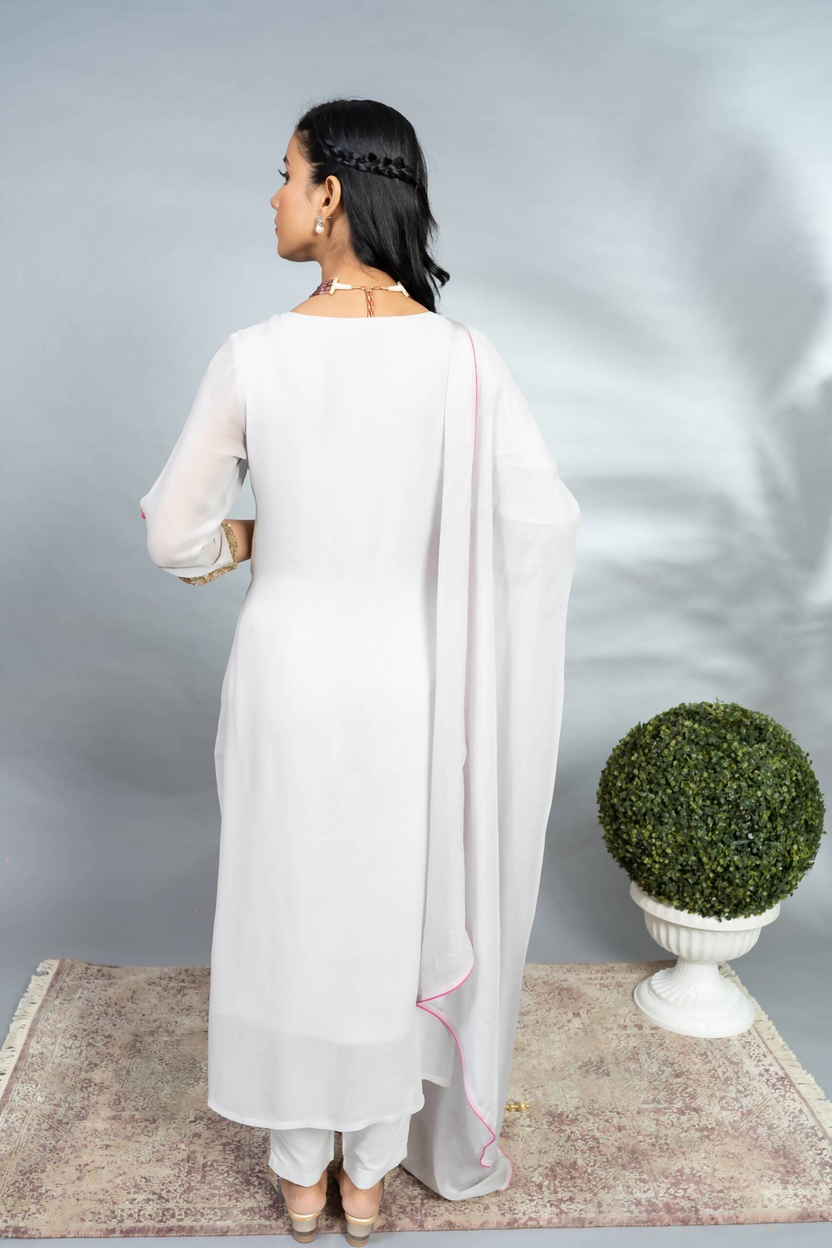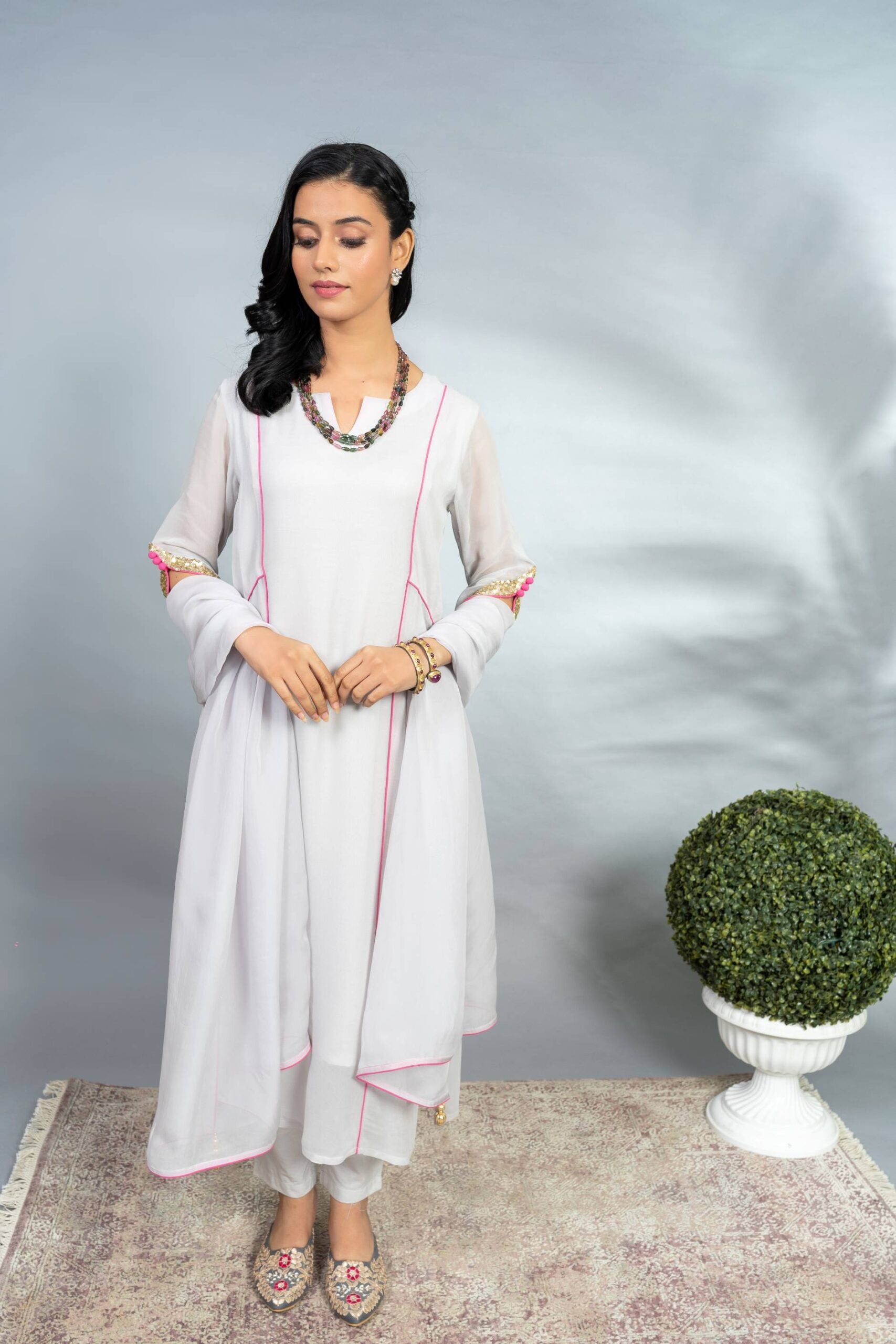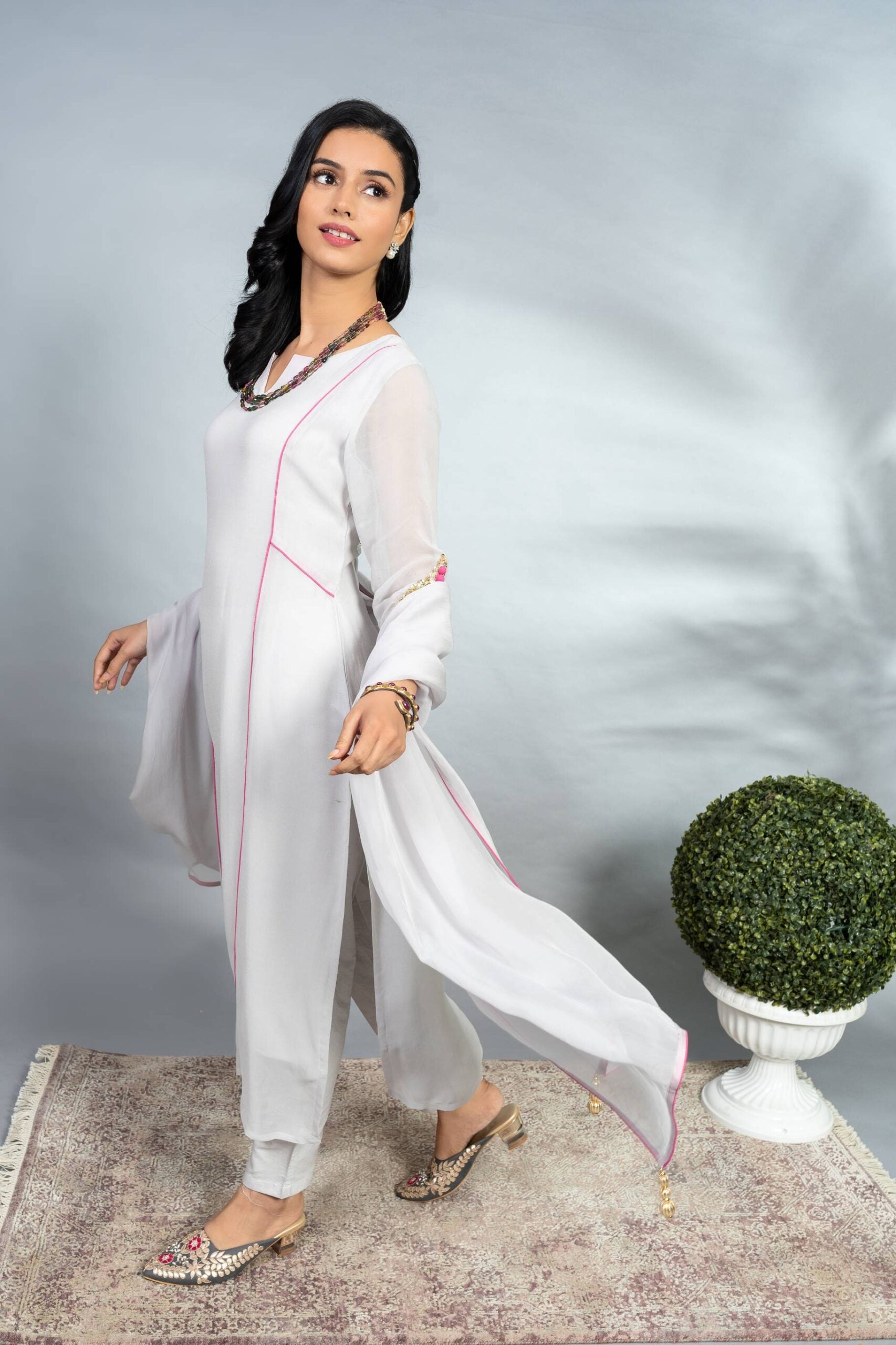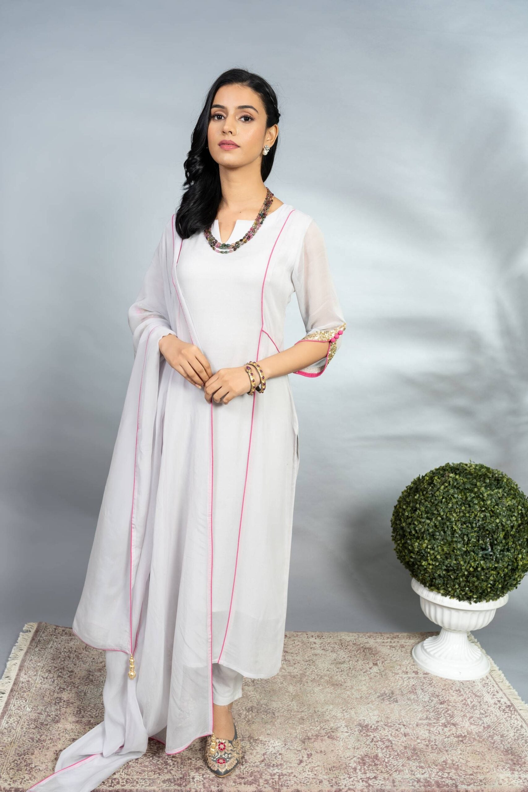 DUSTY GREY GEORGETTE TUNIC WITH CONTRASTING PIPING DETAILS AND SEQUIN HANDWORK ON SLEEVES PAIRED WITH COTTON SILK PANTS AND A GEORGETTE DUPATTA