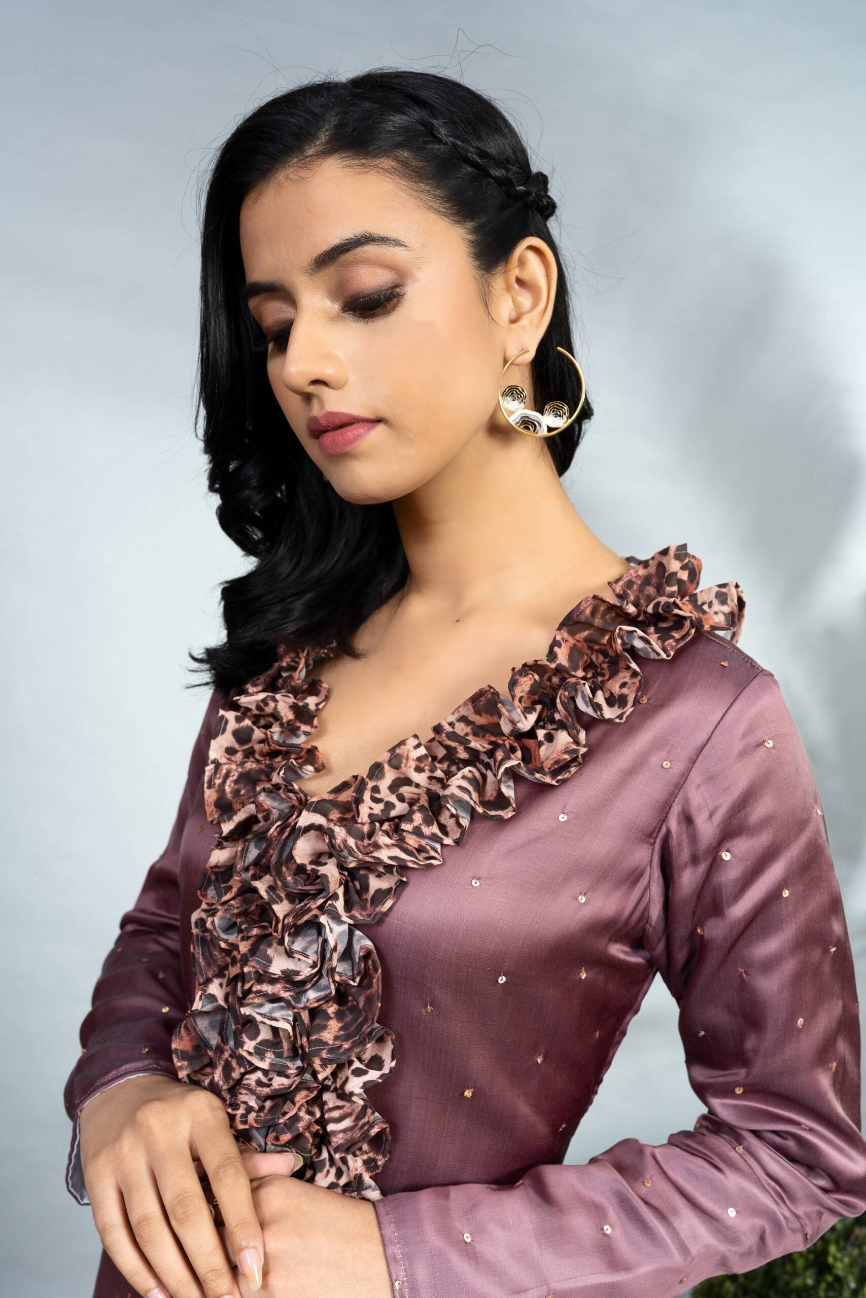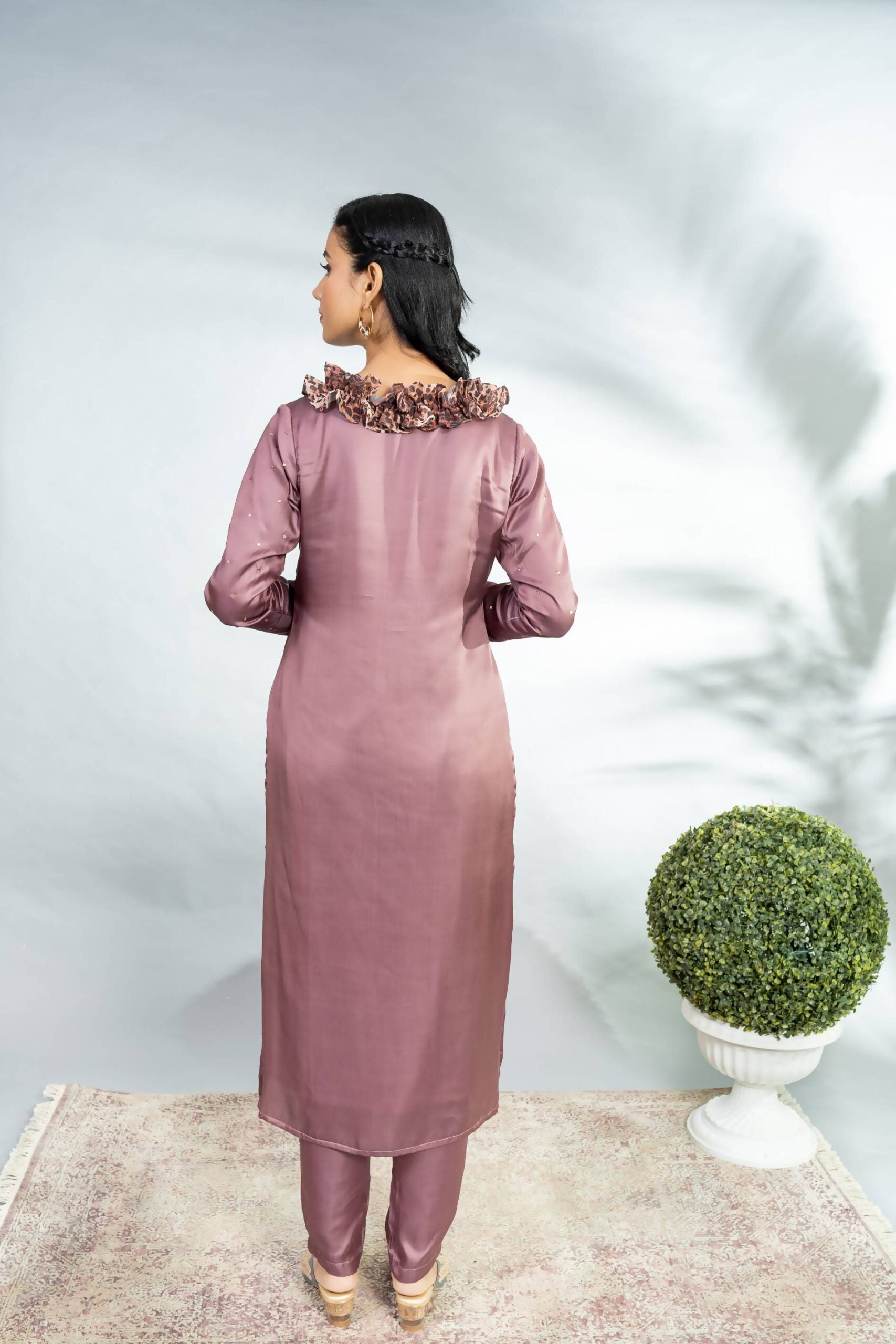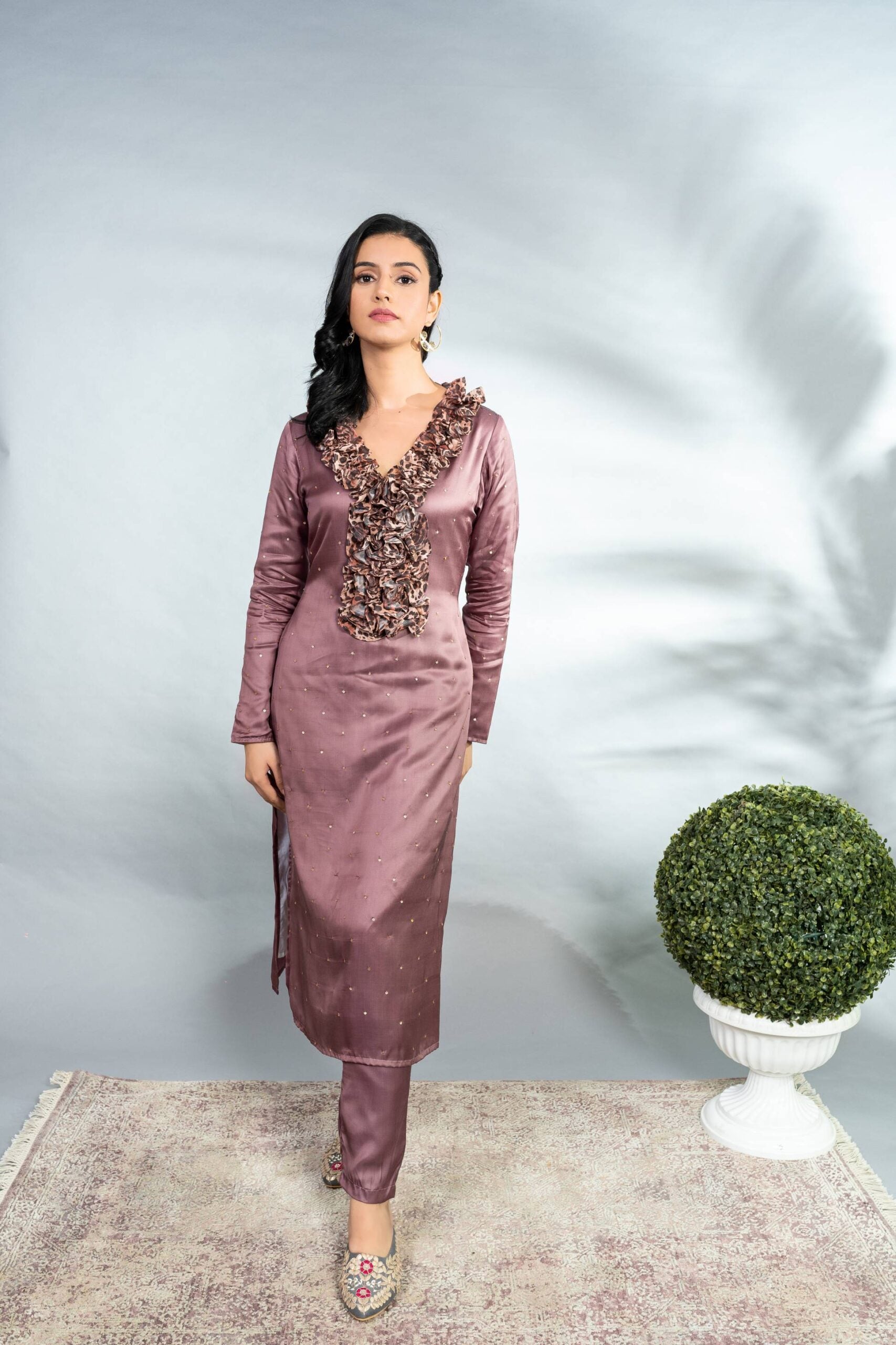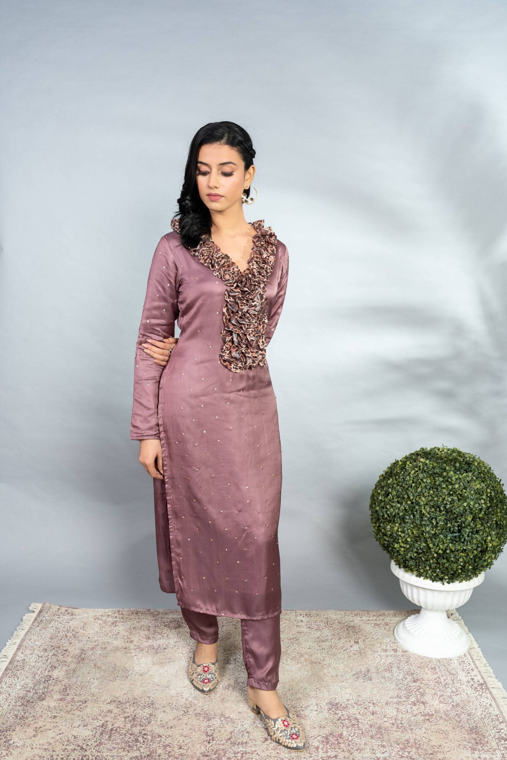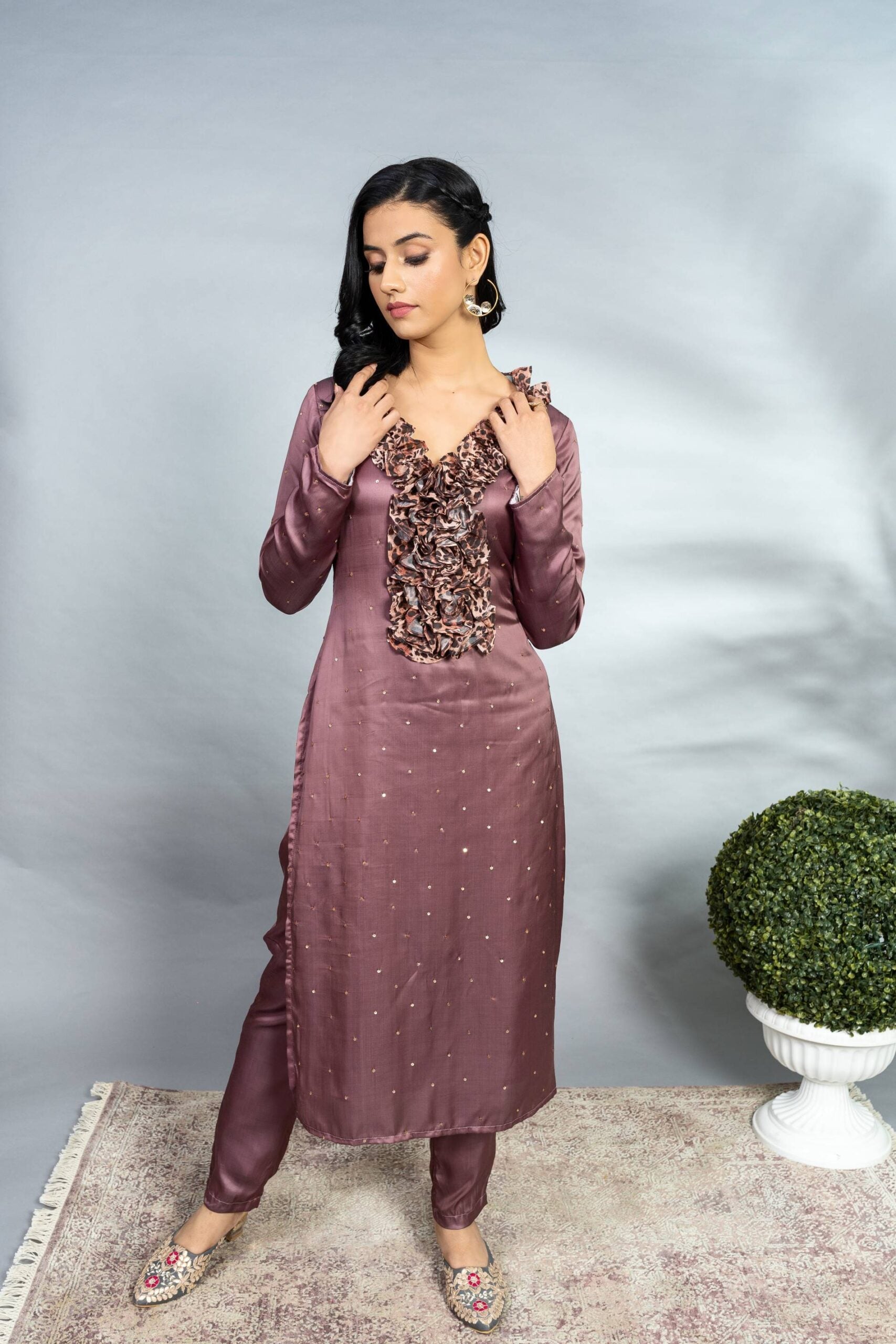 MODAL SATIN FULL SLEEVES TUNIC WITH ANIMAL PRINTED FRILL COLLAR AND SEQUIN SCATTER ALL OVER PAIRED WITH A MODAL SATIN CIGARETTE PANT
