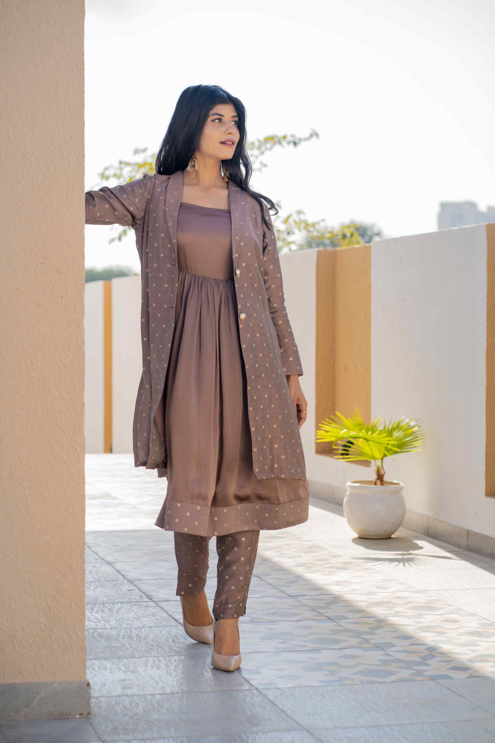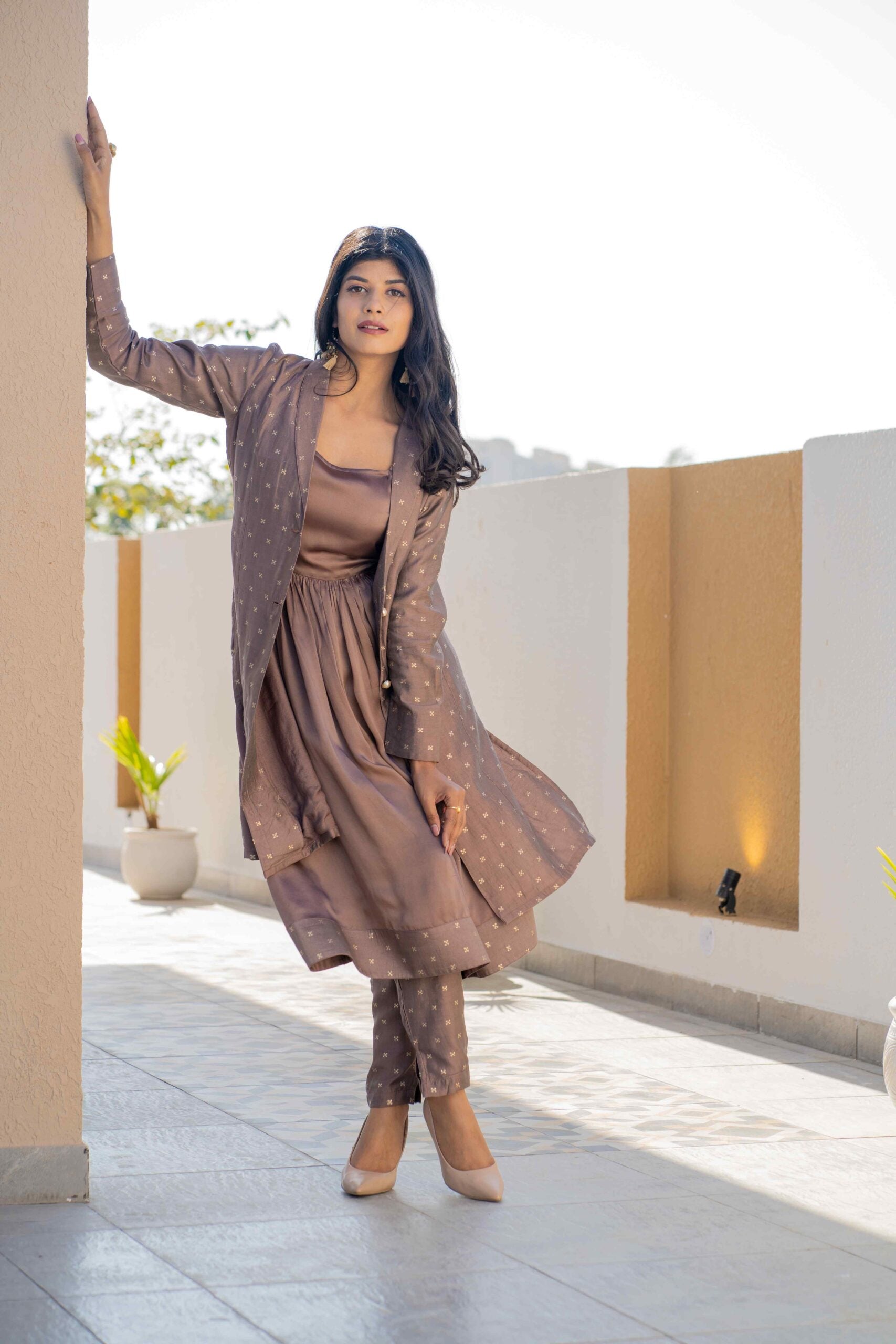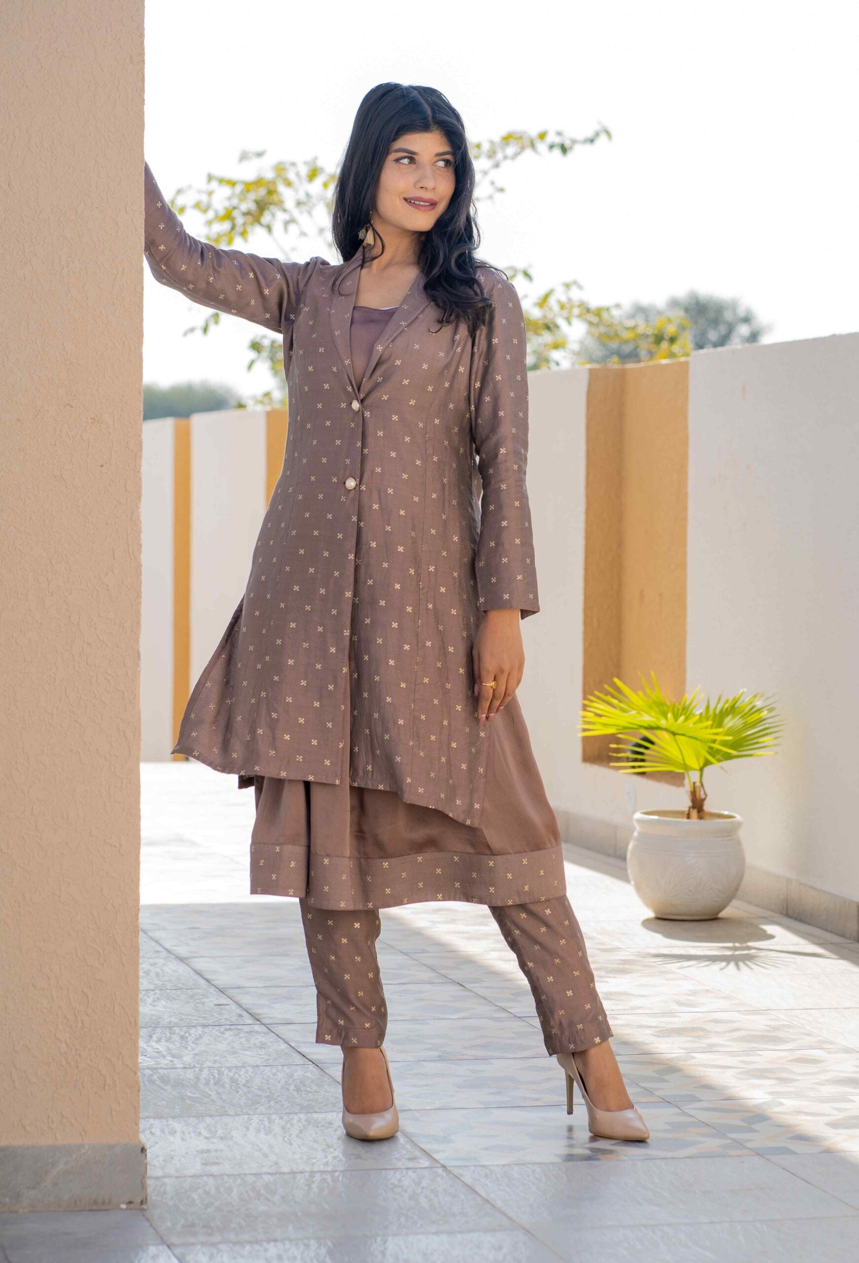 BAMBERG SATIN FIT & FLARE TUNIC WITH SELF GOLDEN ZARI CHANDERI JACKET AND PANT