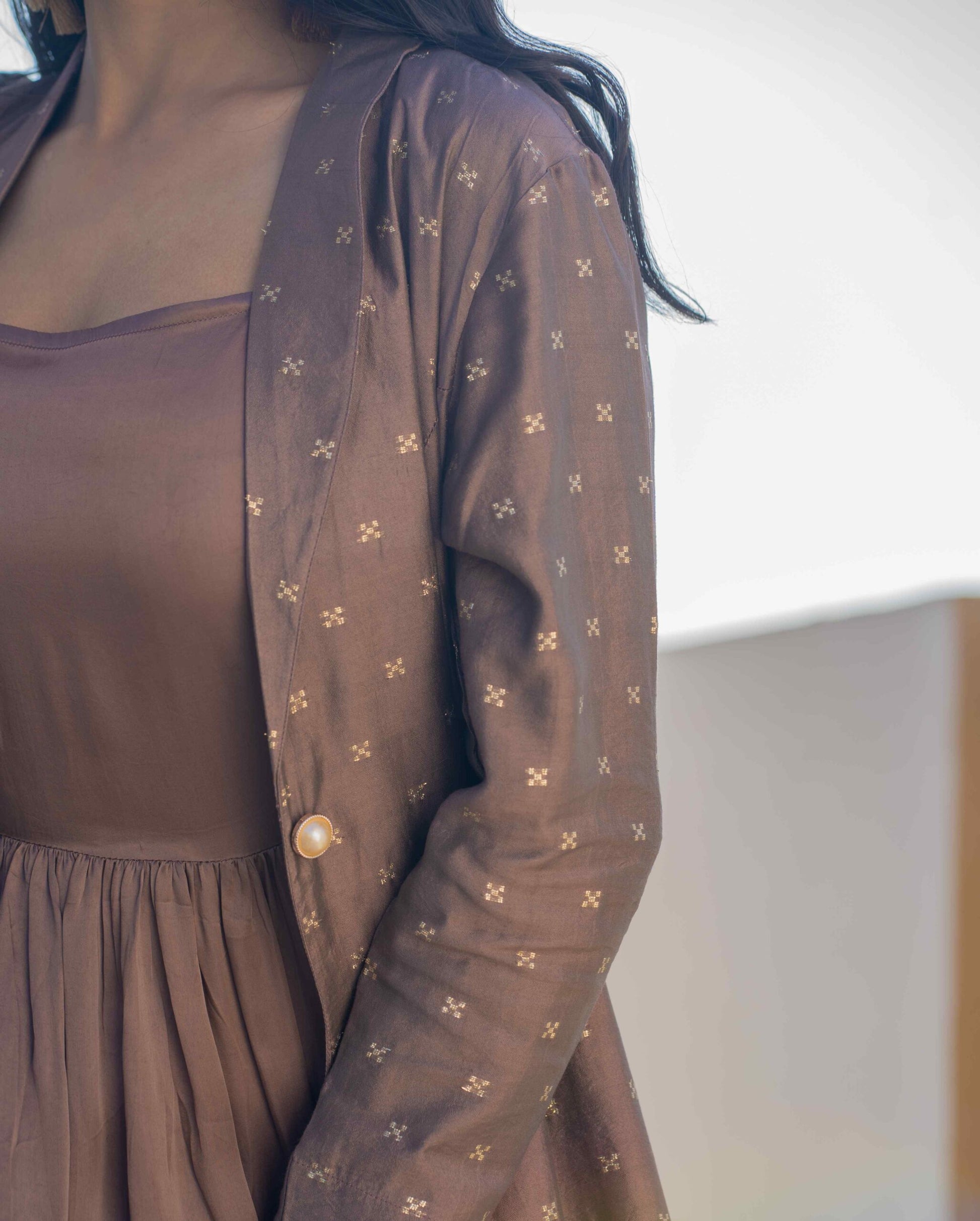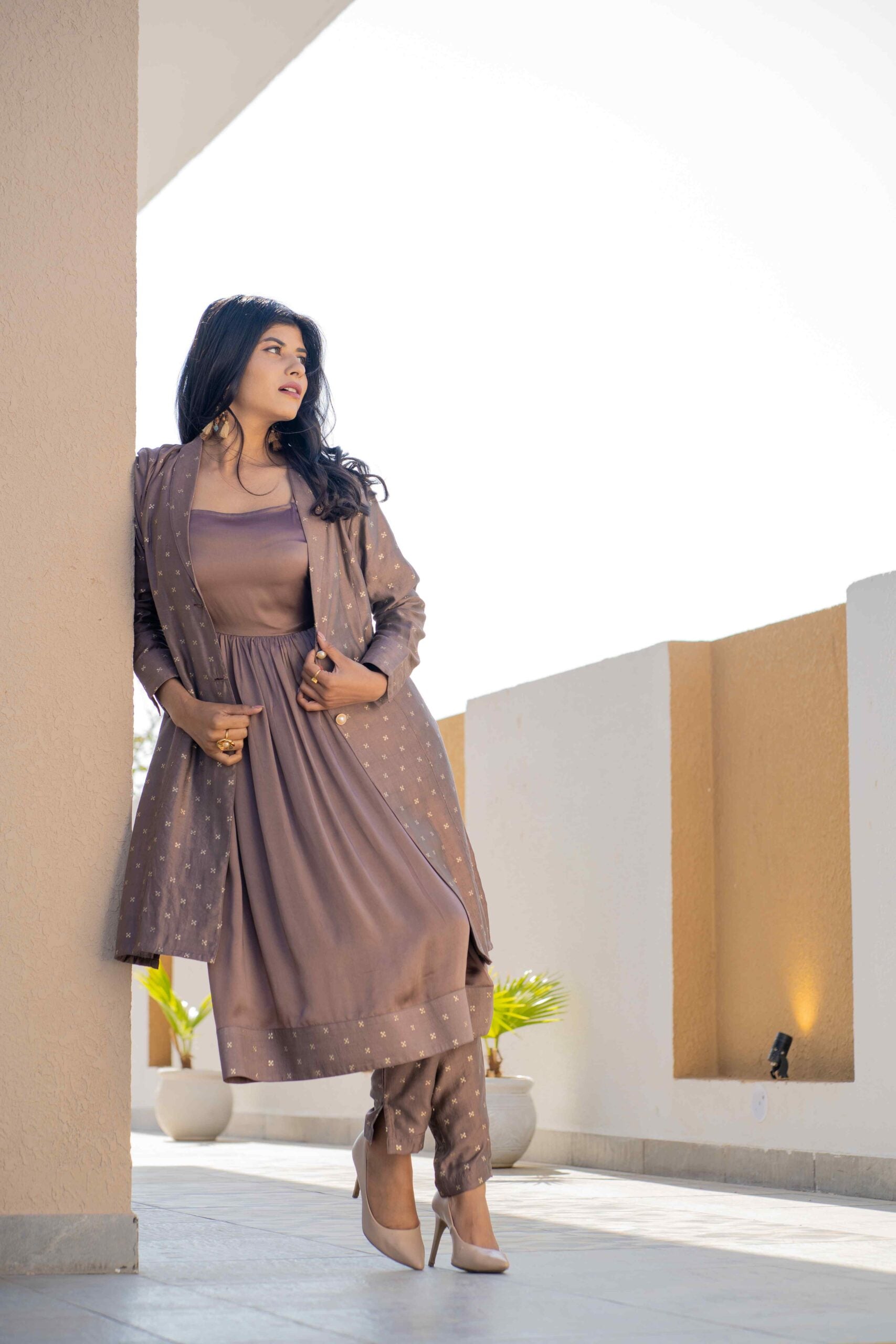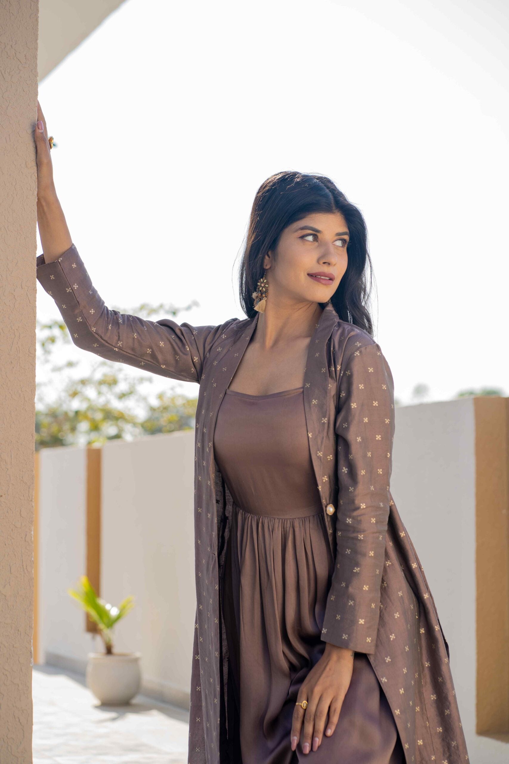 BAMBERG SATIN FIT & FLARE TUNIC WITH SELF GOLDEN ZARI CHANDERI JACKET AND PANT