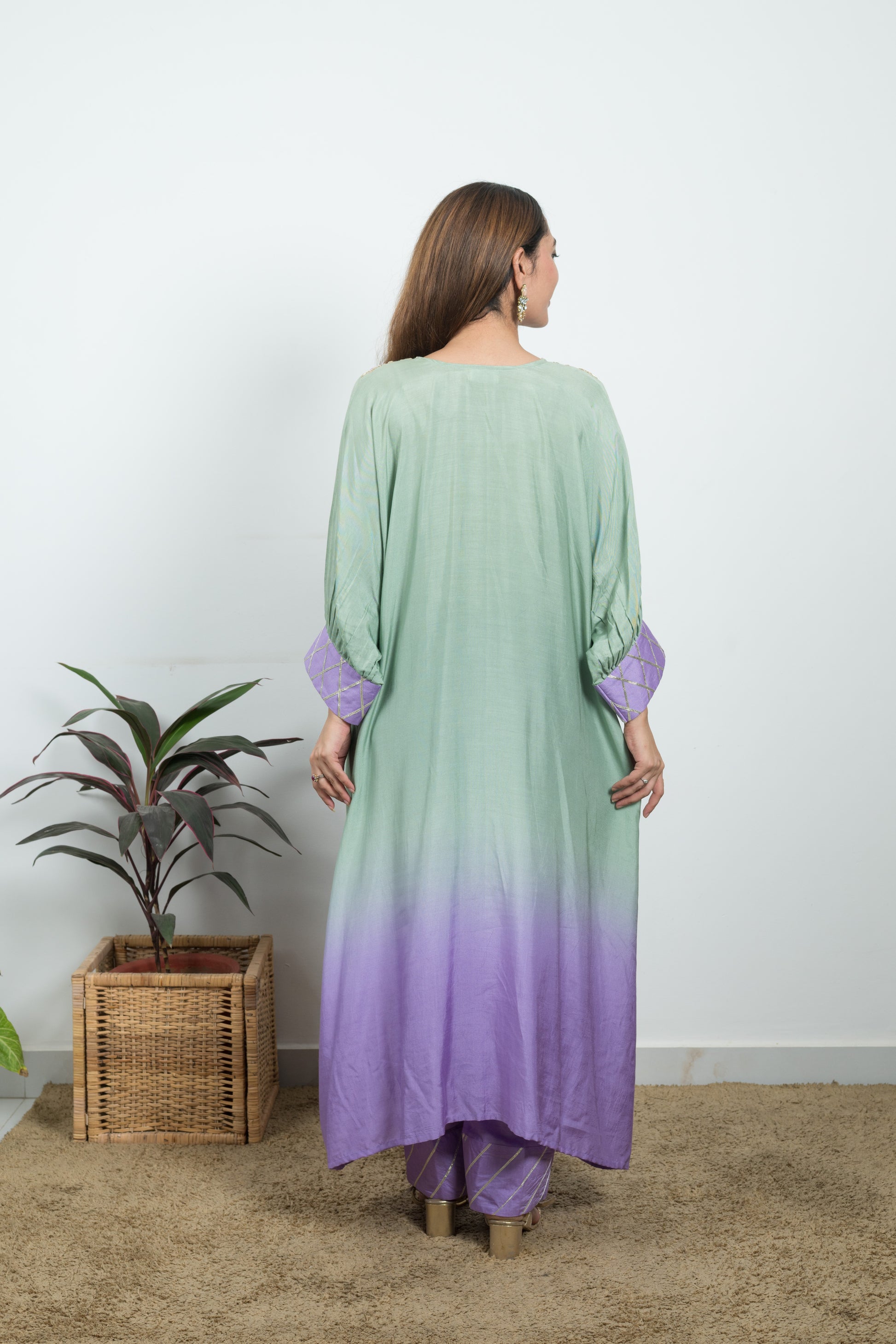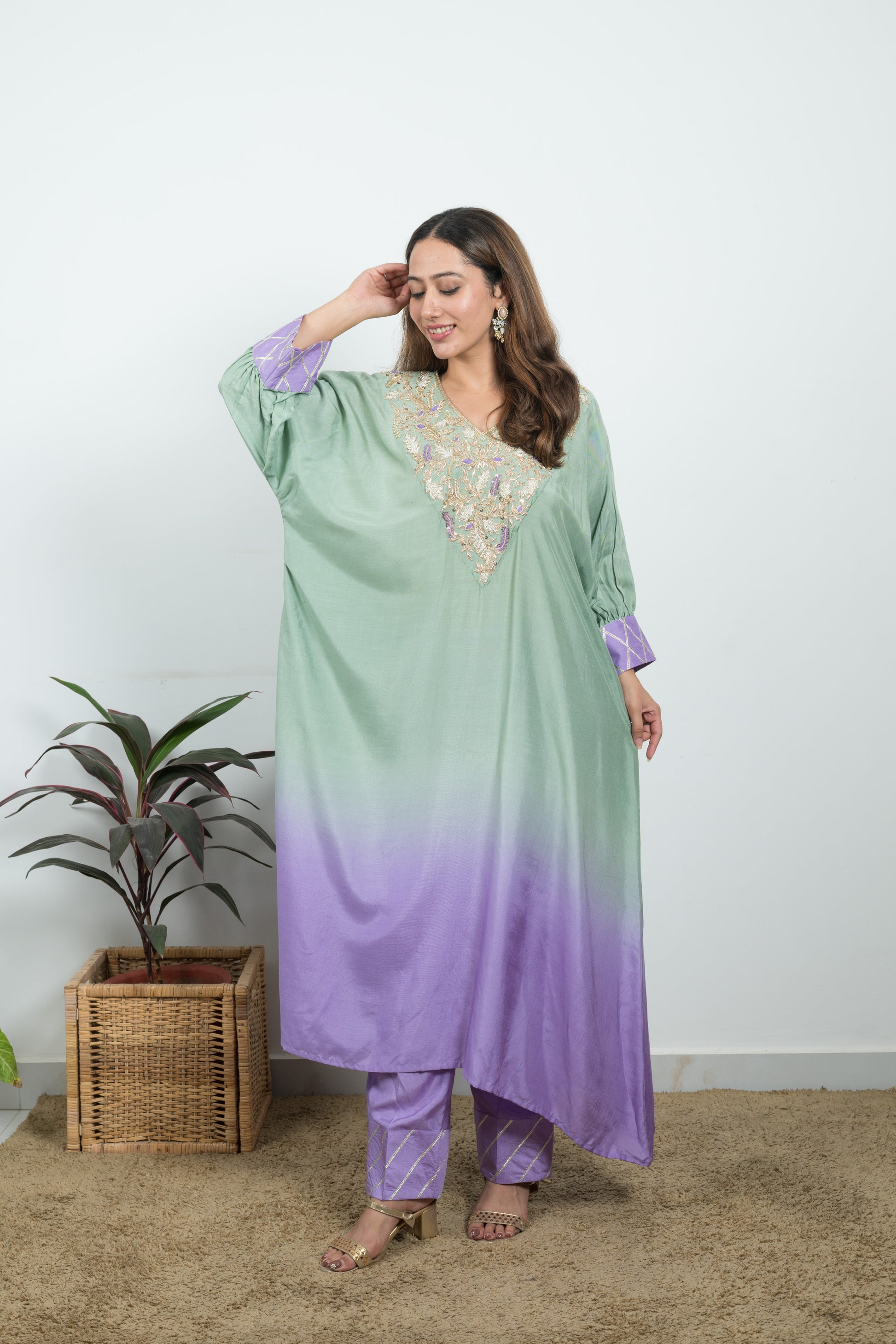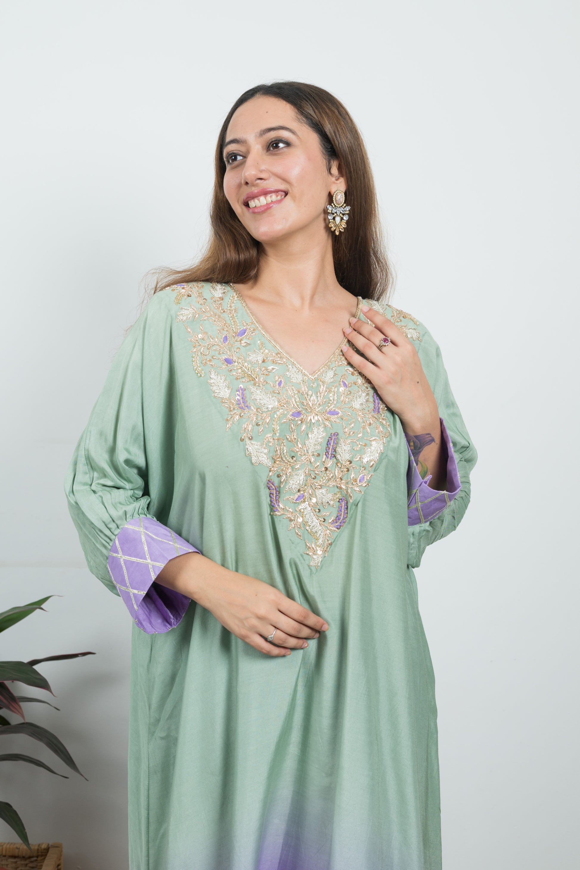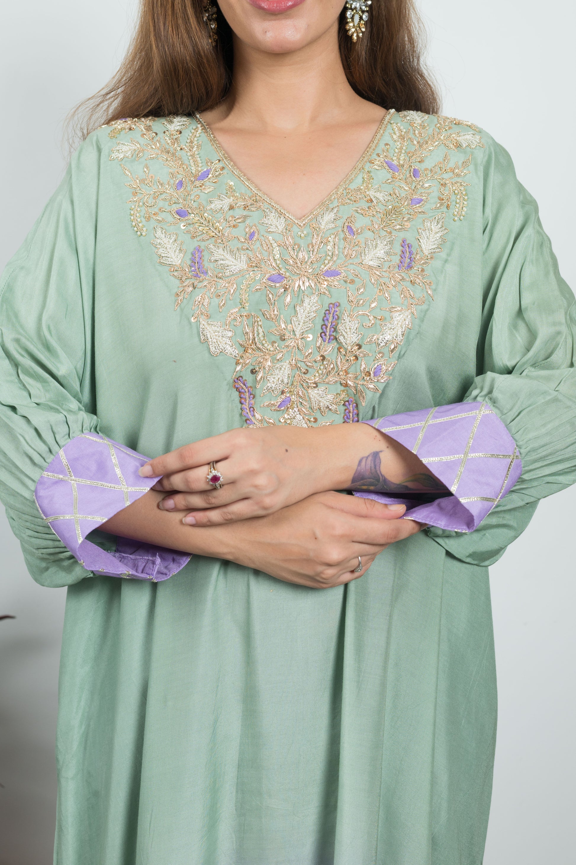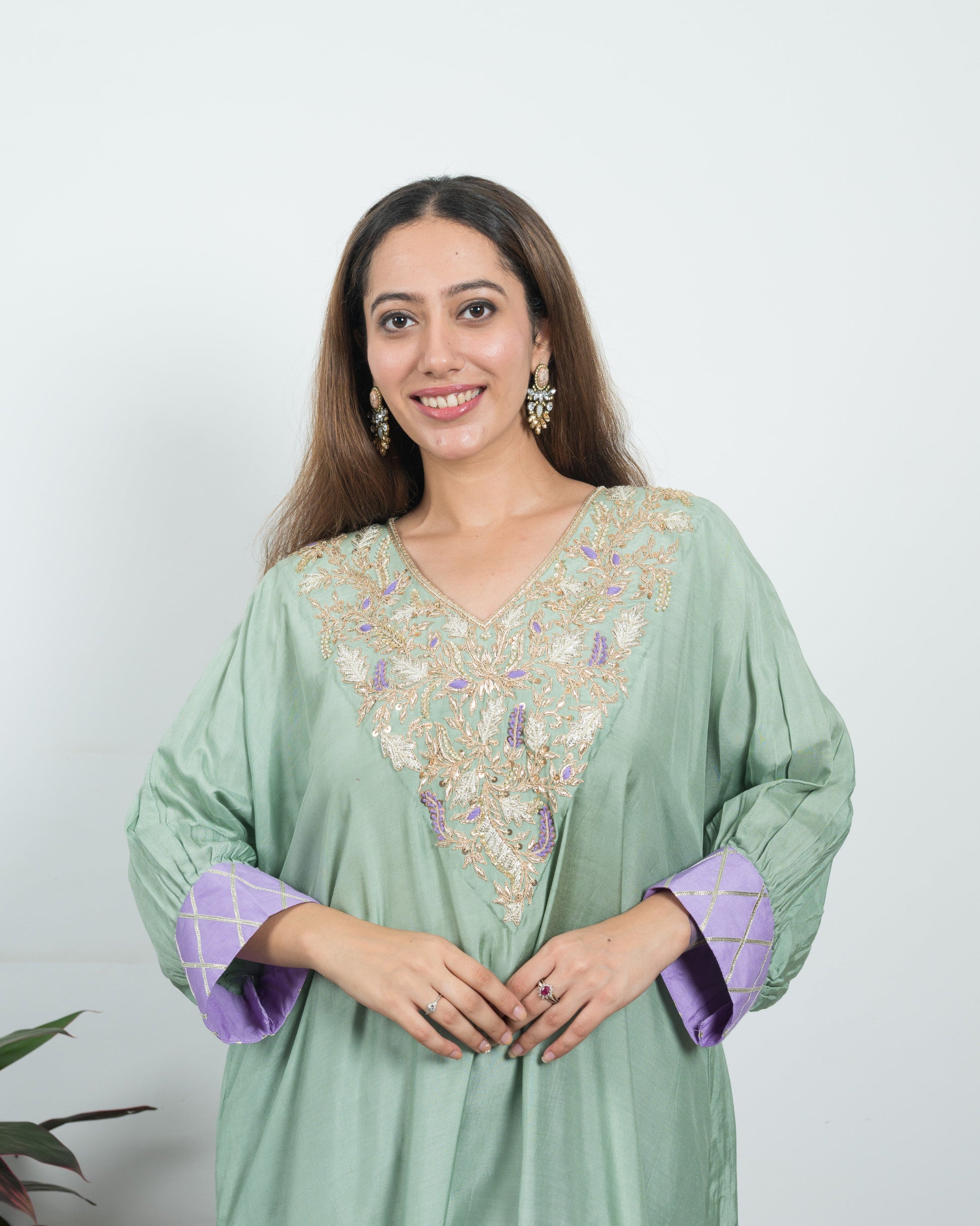 Zardosi, sequin & dabka handwork on neckline and Gota borders on cuff & pants