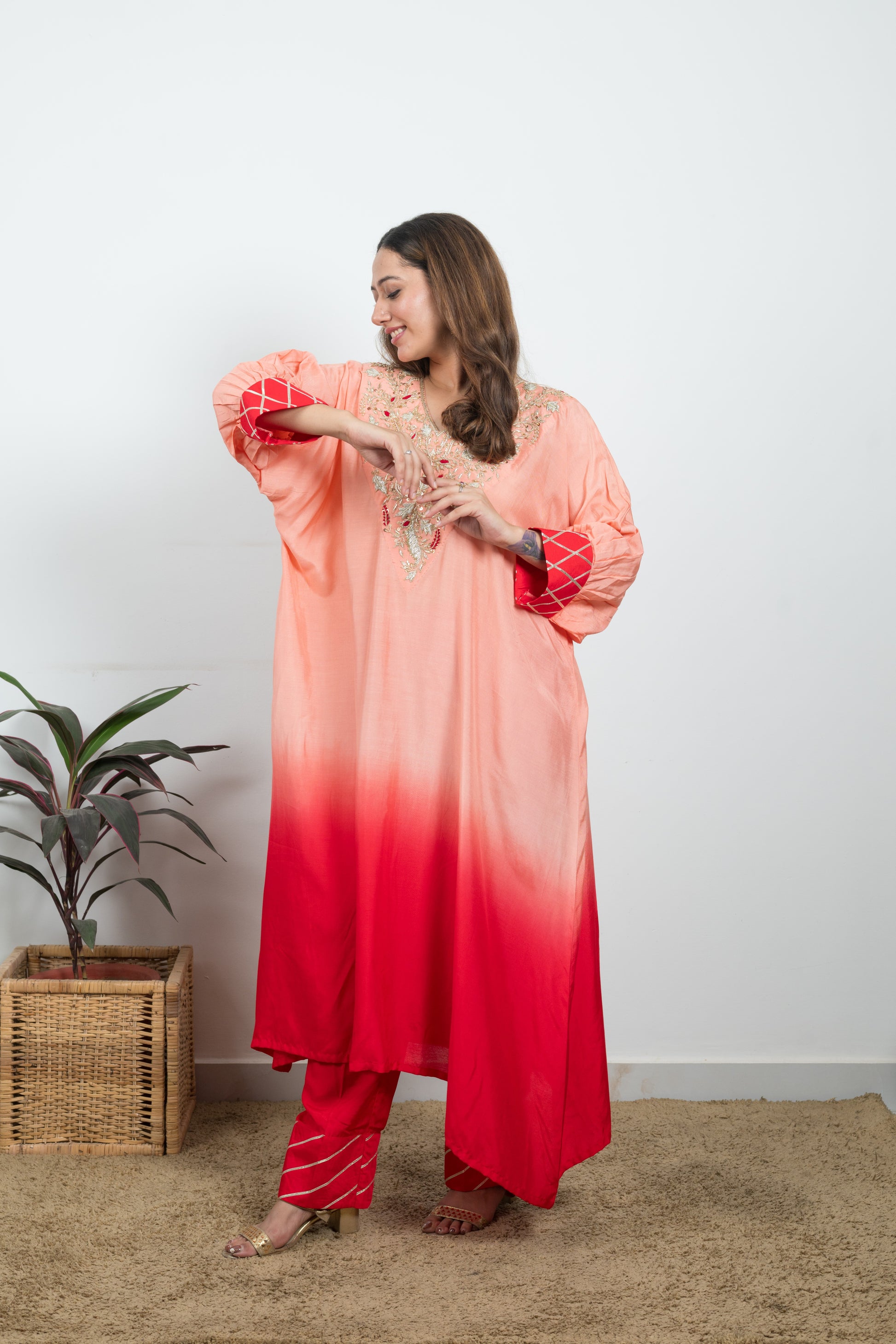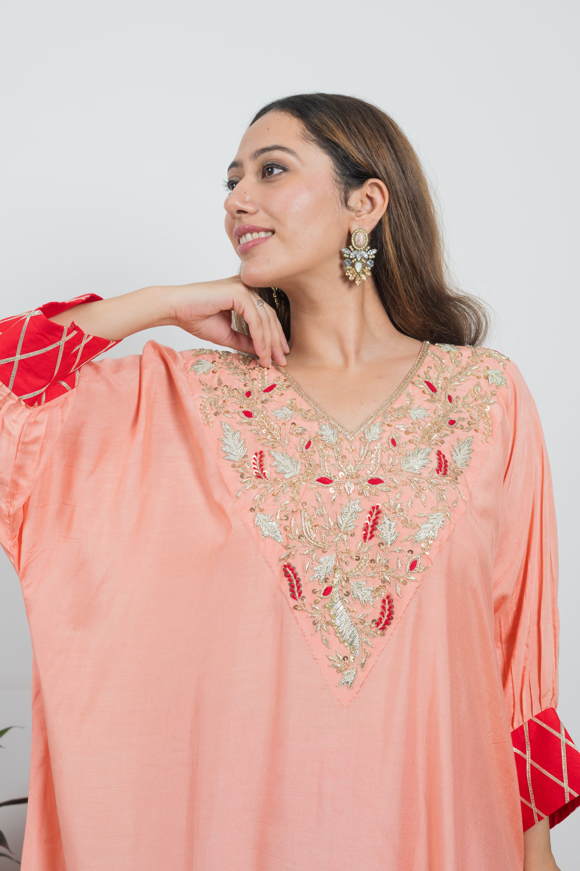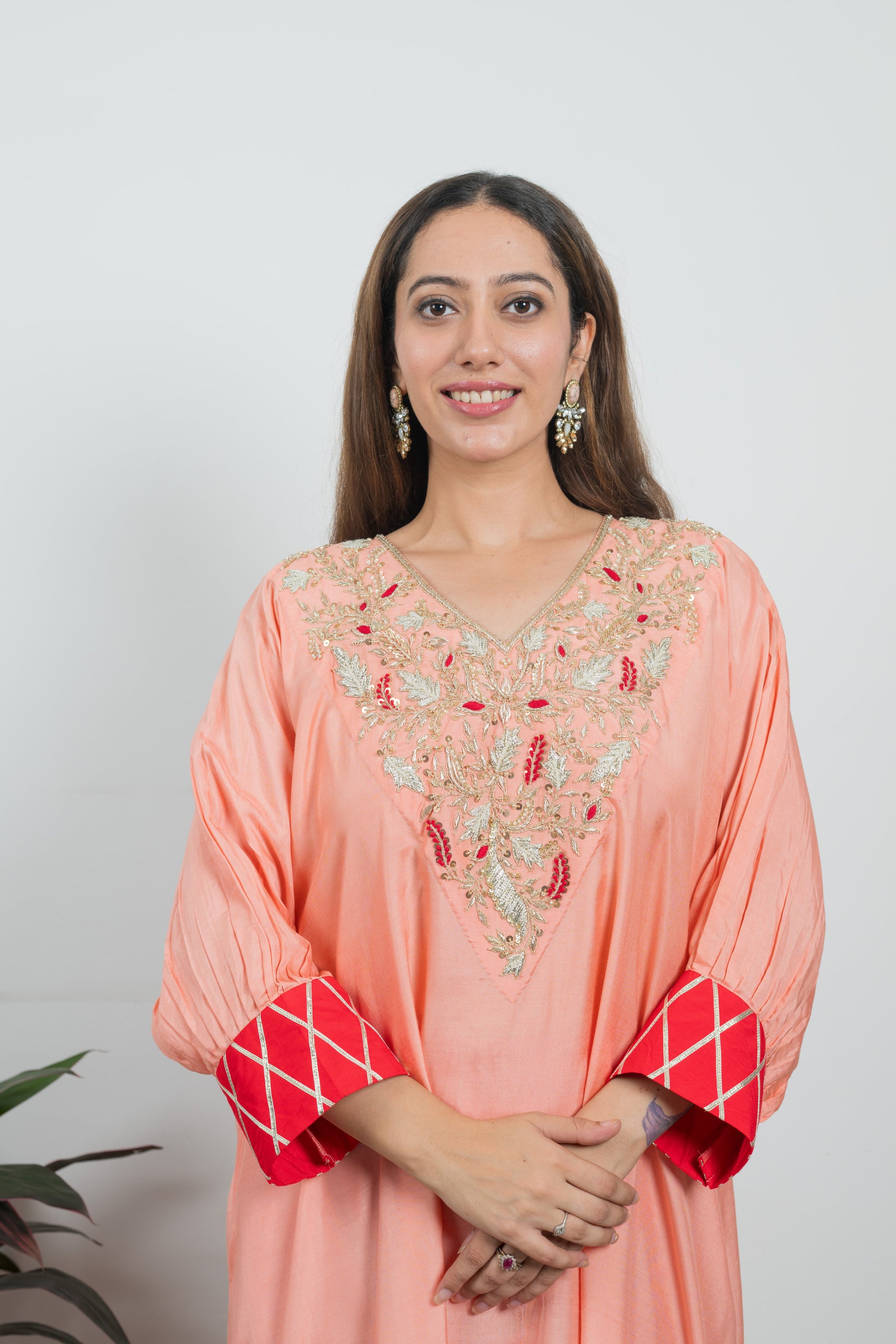 Embroidery/ Handwork ColourZardosi, sequin & dabka handwork on neckline and Gota borders on cuff & pants