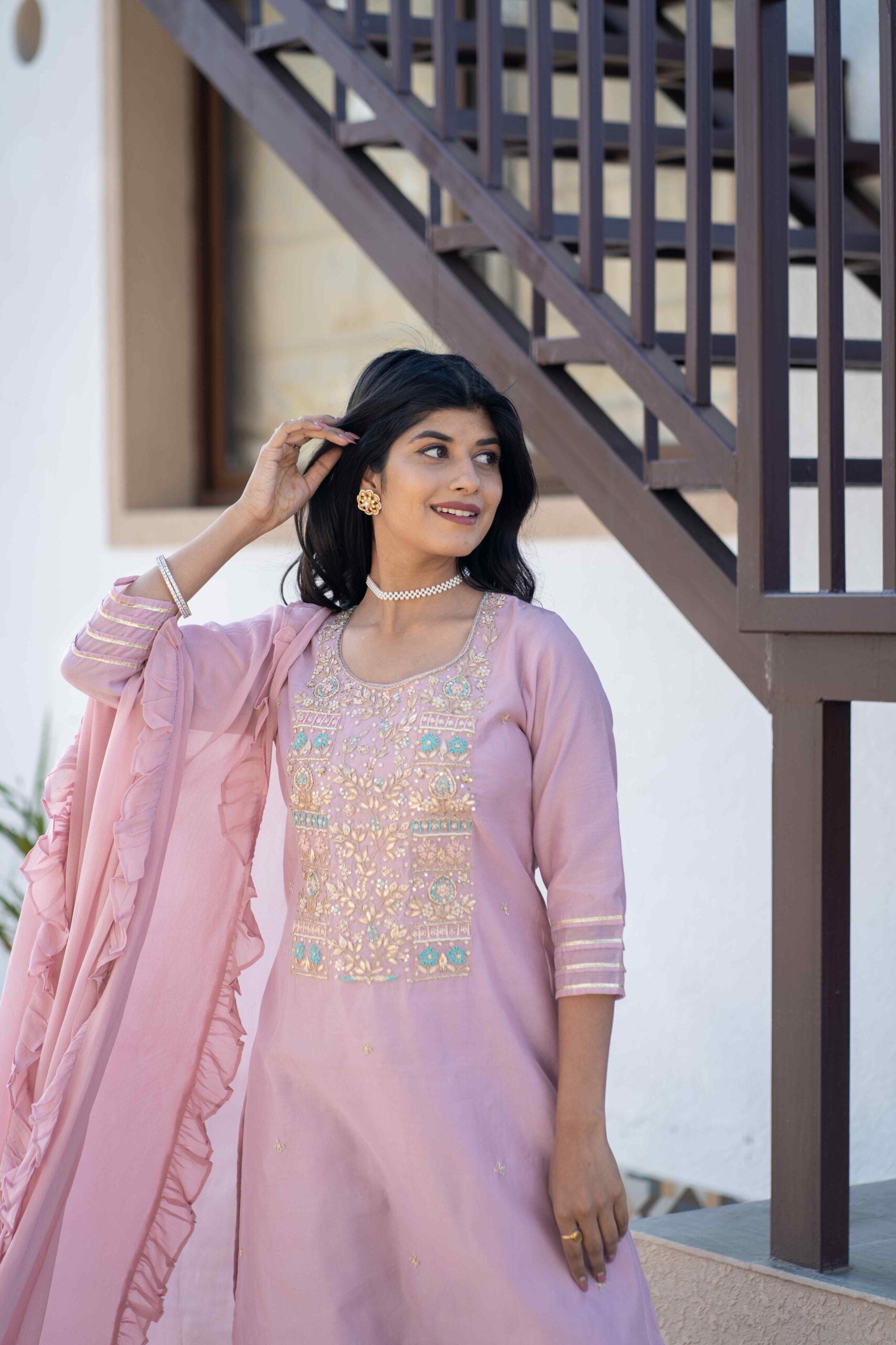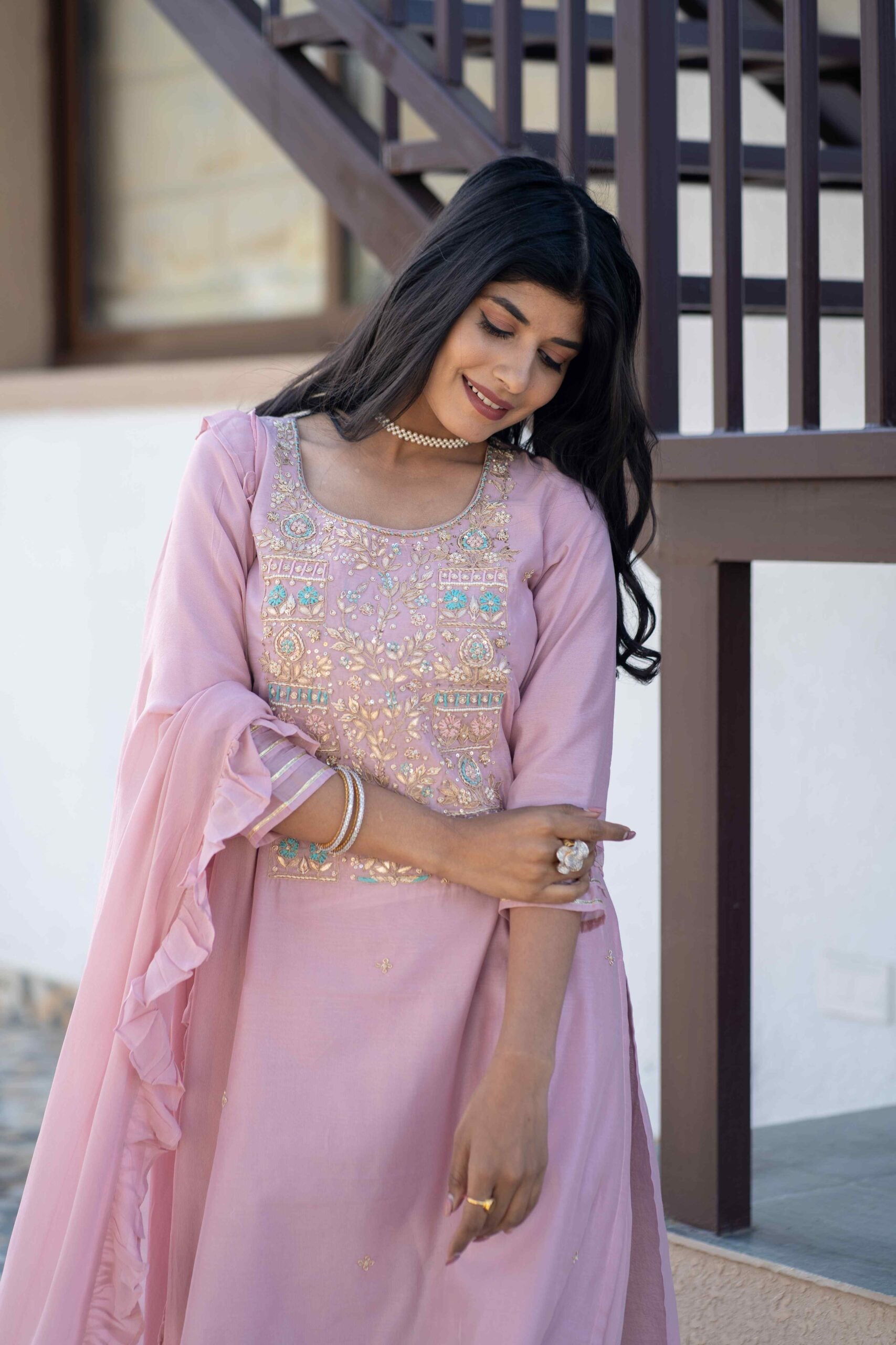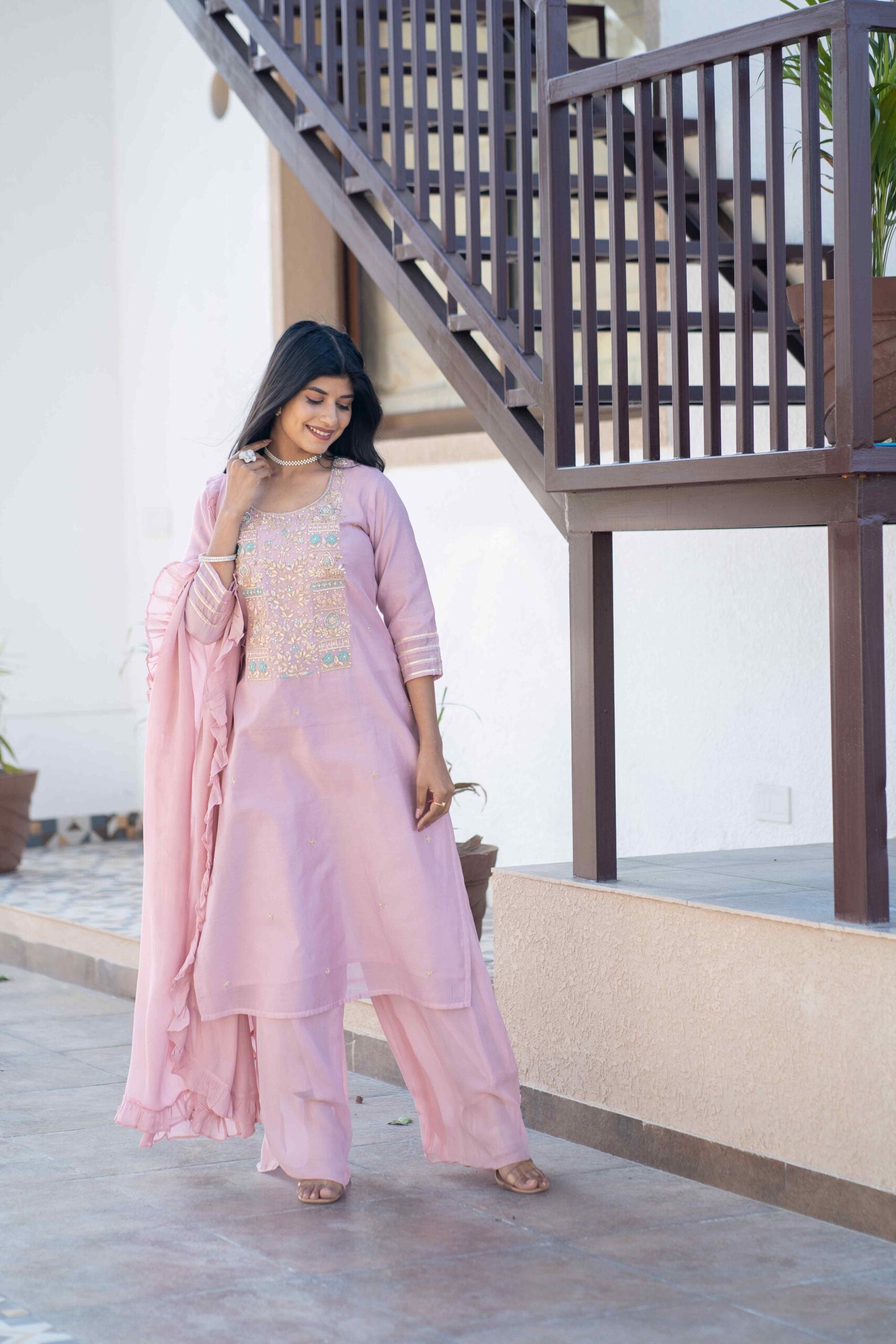 CHANDERI TUNIC WITH HANDWORK ON YOKE PAIRED WITH GEORGETTE STRAIGHT PANTS & A FRILL GEORGETTE DUPATTA