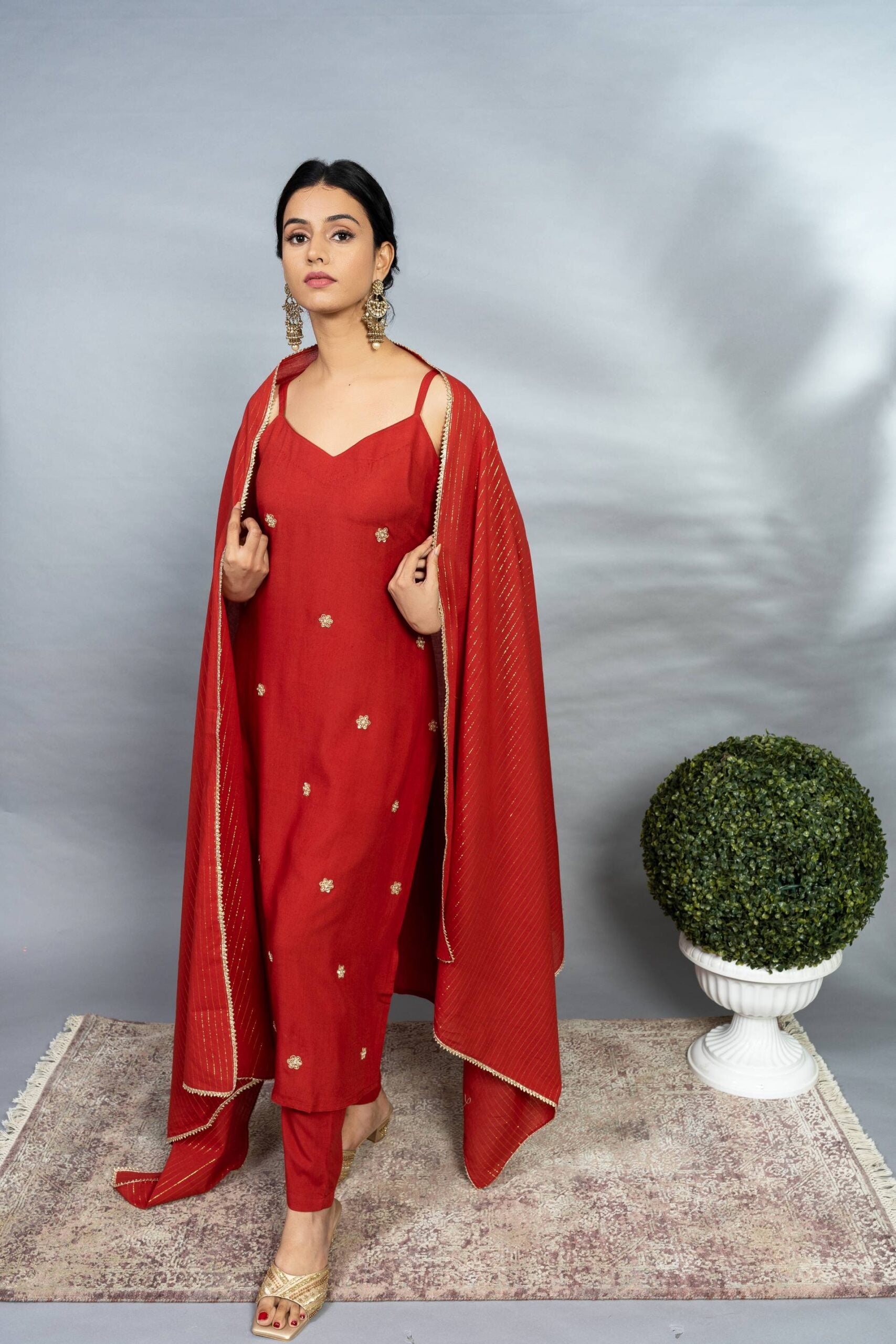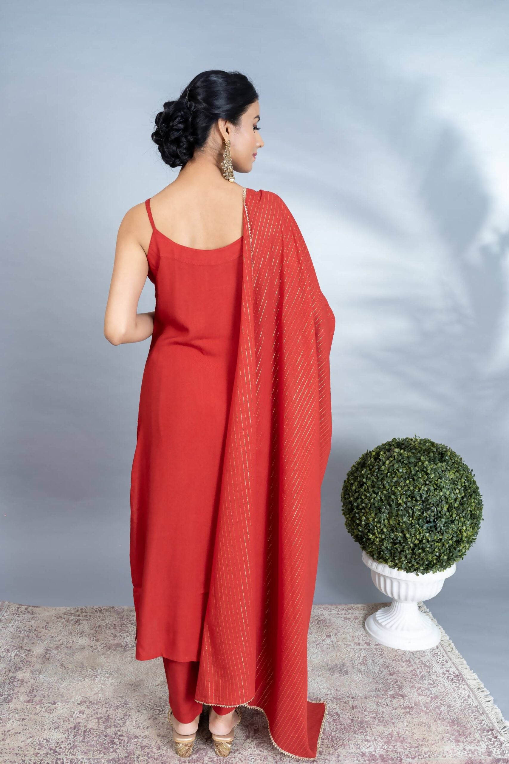 MODAL COTTON STRAP TUNIC WITH HANDWORK MOTIFS PAIRED WITH MODAL COTTON CIGARETTE PANTS AND A LUREX COTTON DUPATTA WITH LACE DETAILS