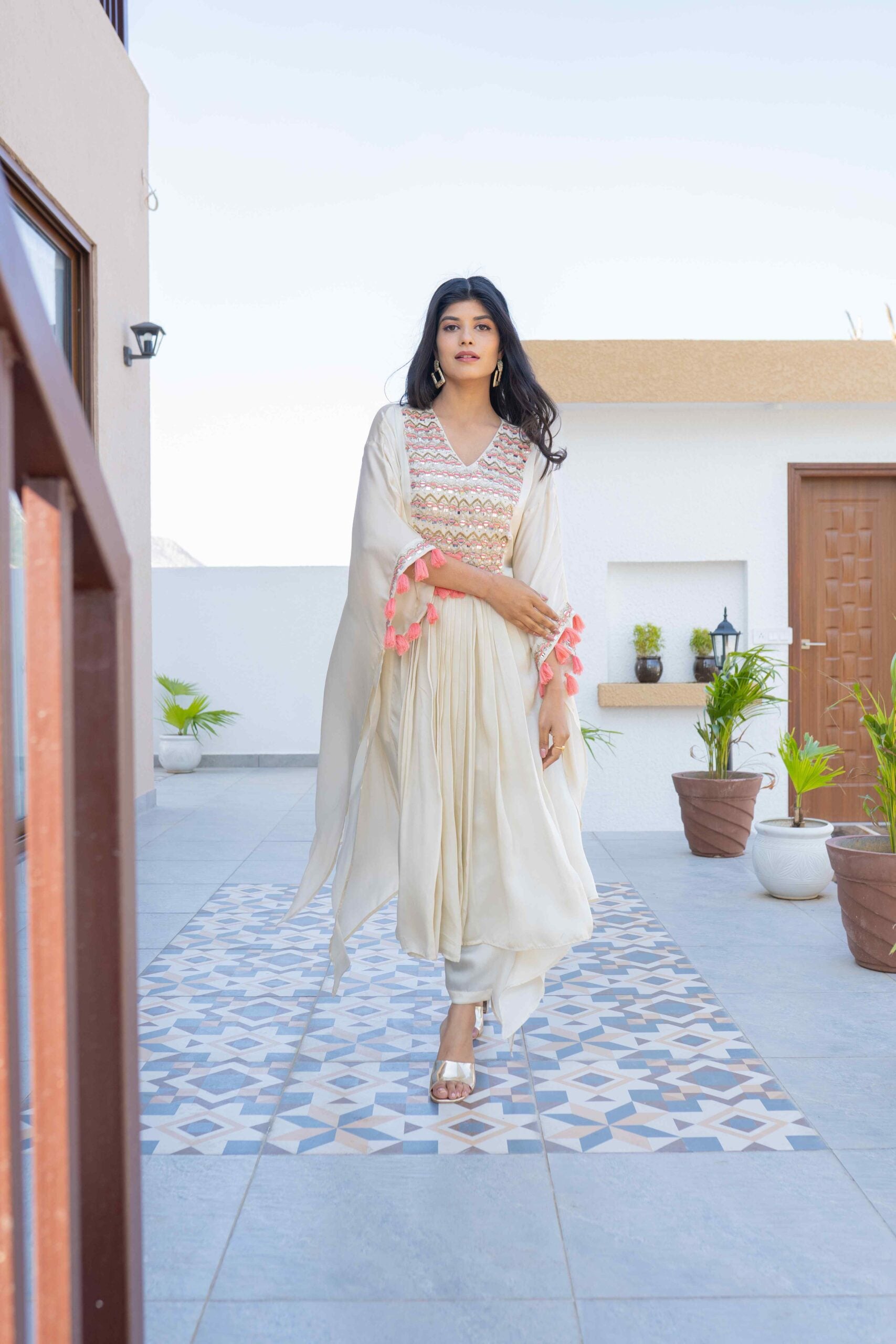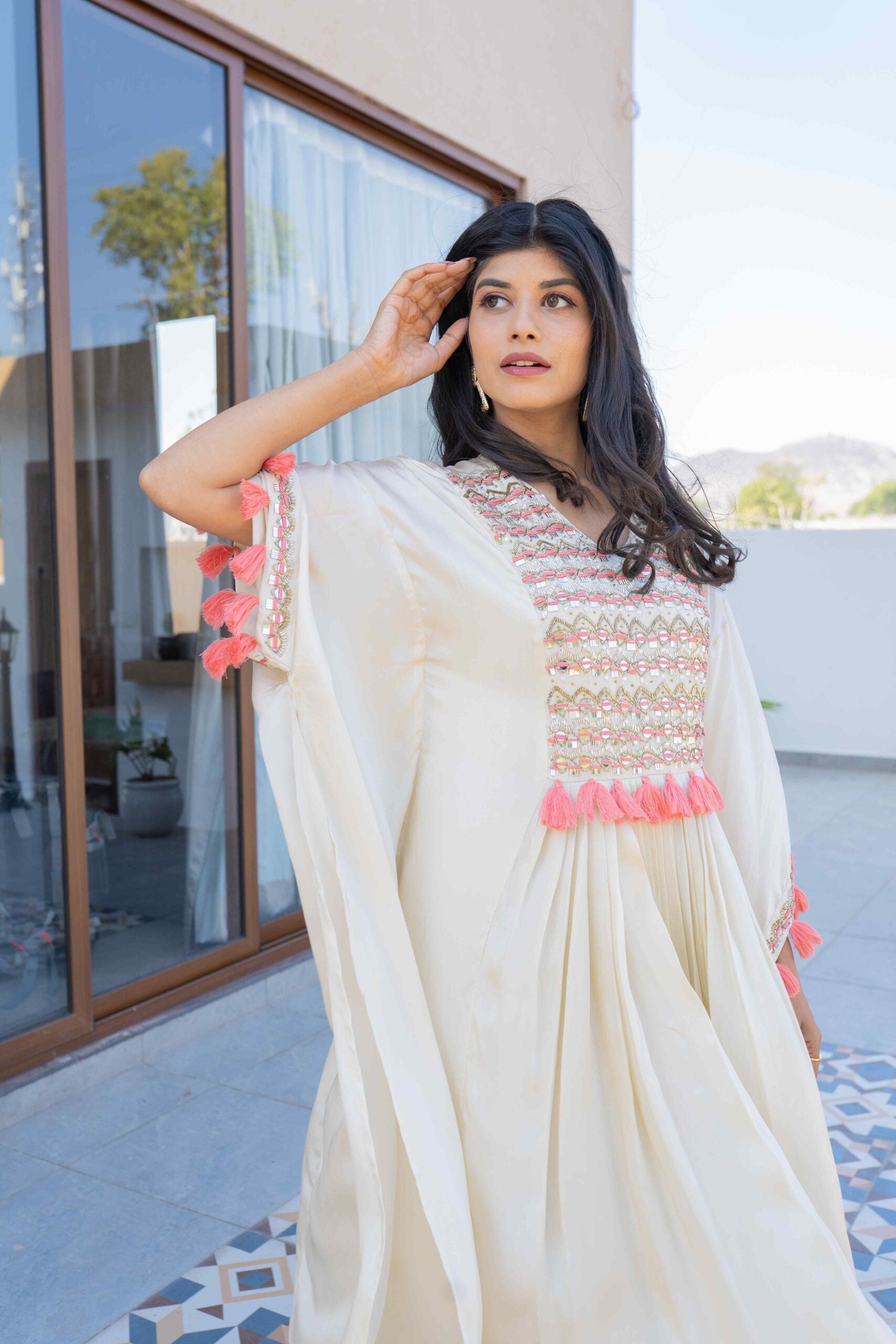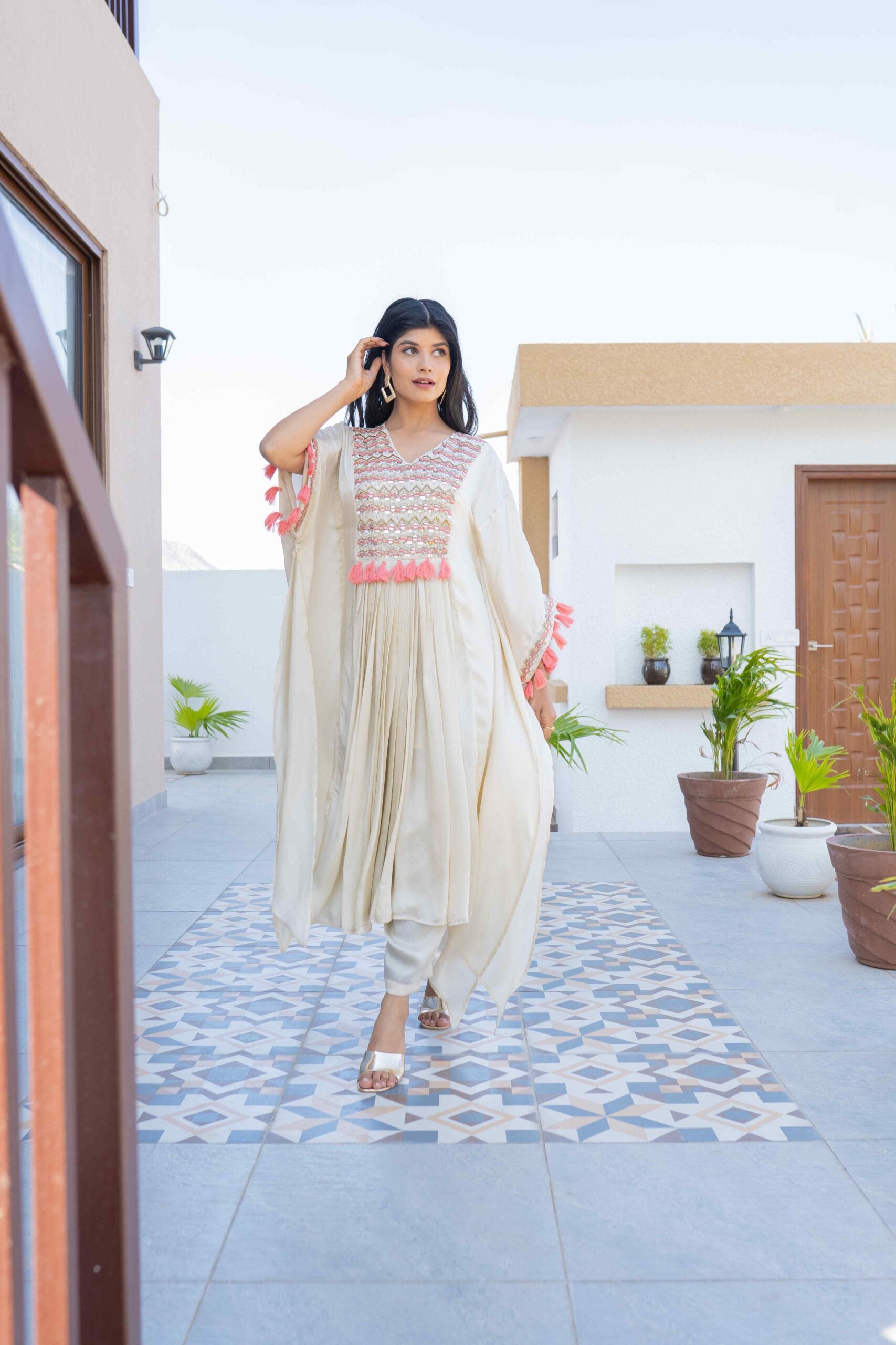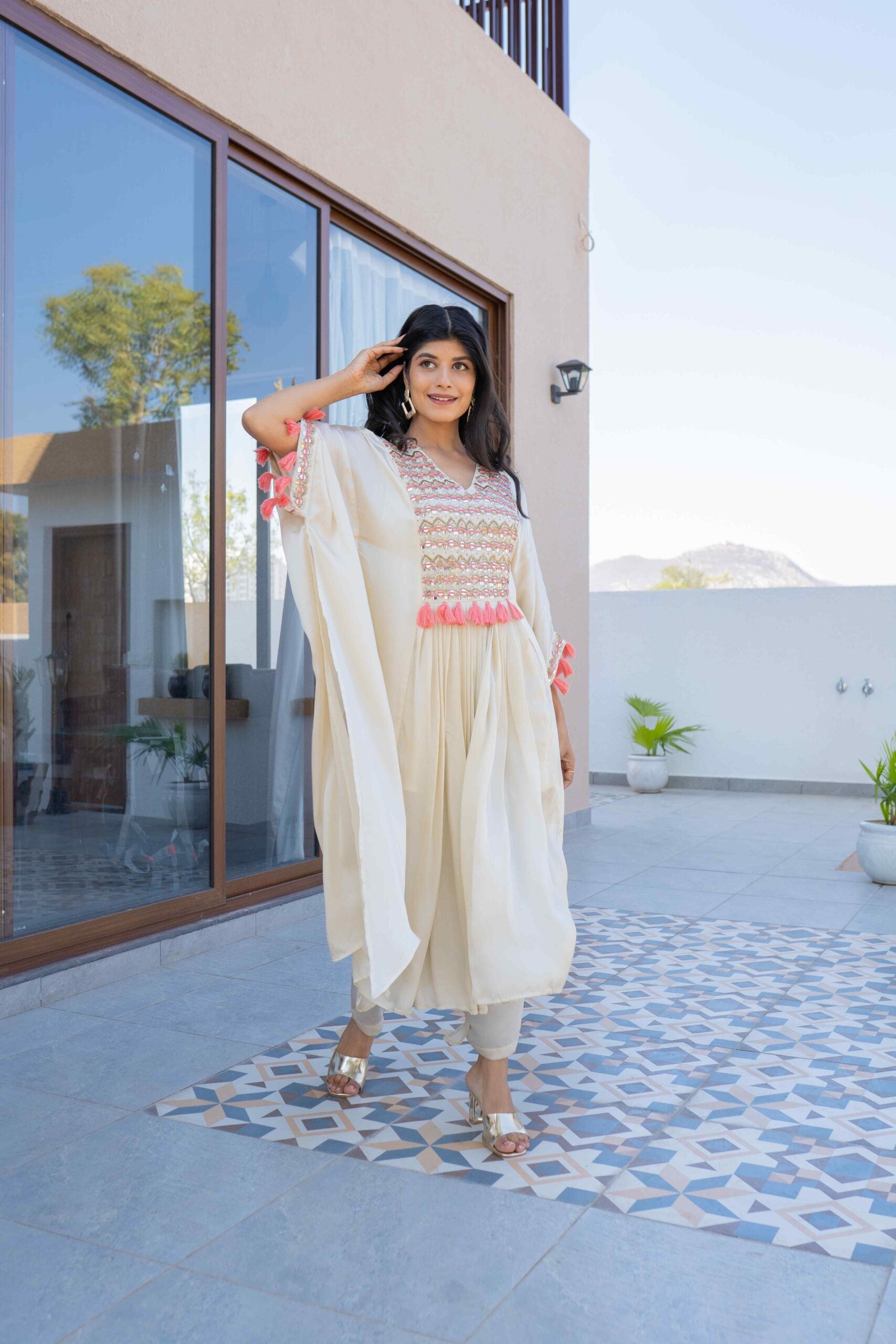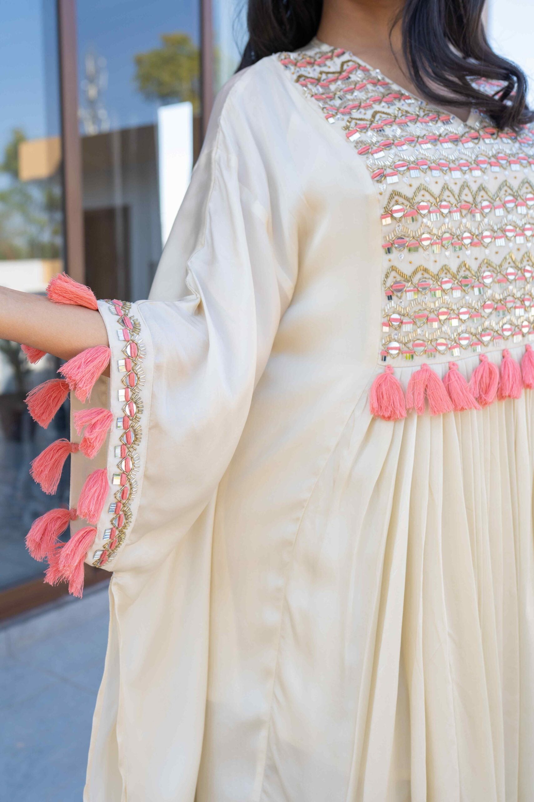 BAMBERG SATIN KAFTAN WITH MIRROR HANDWORK AND HANDMADE TASSELS ALONG WITH PANTS & INNER INSIDE