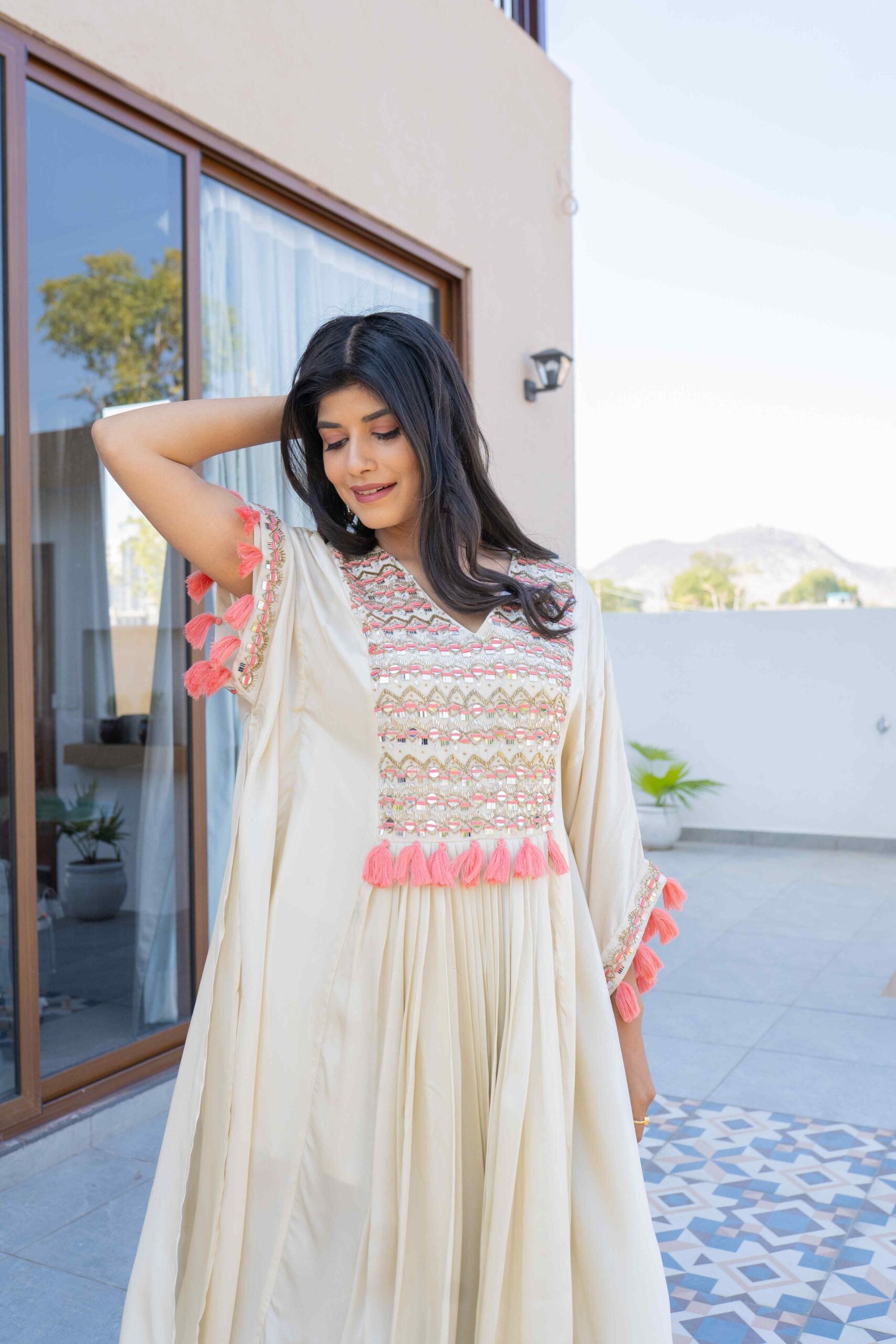 MIRROR HANDWORK WITH PEACH THREAD AND PEACH HANDMADE TASSELS