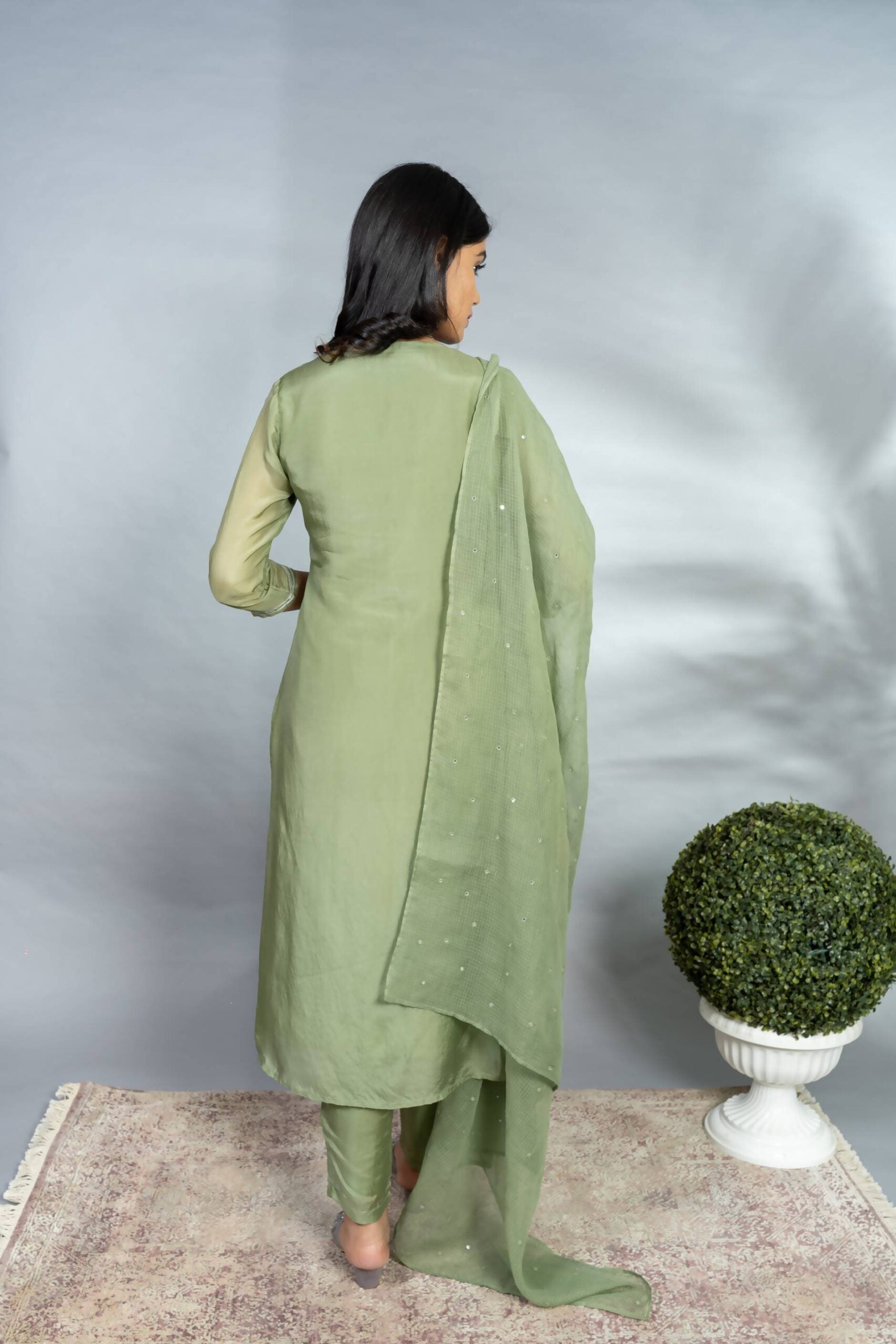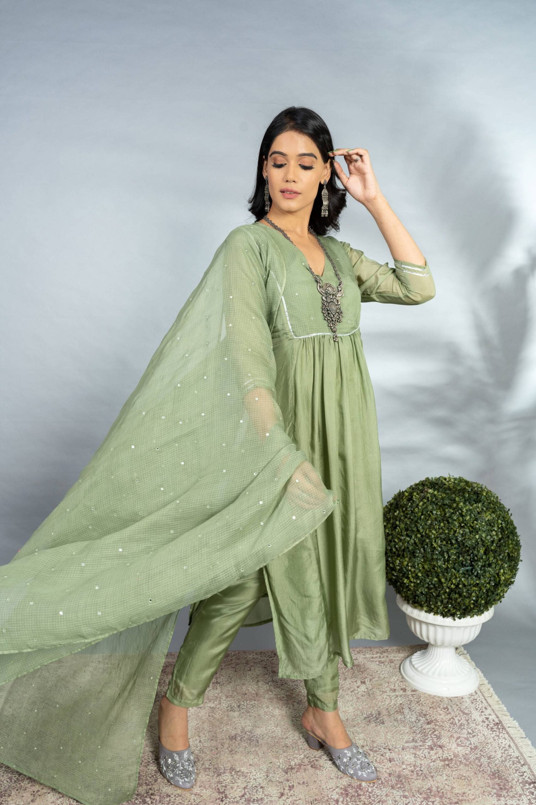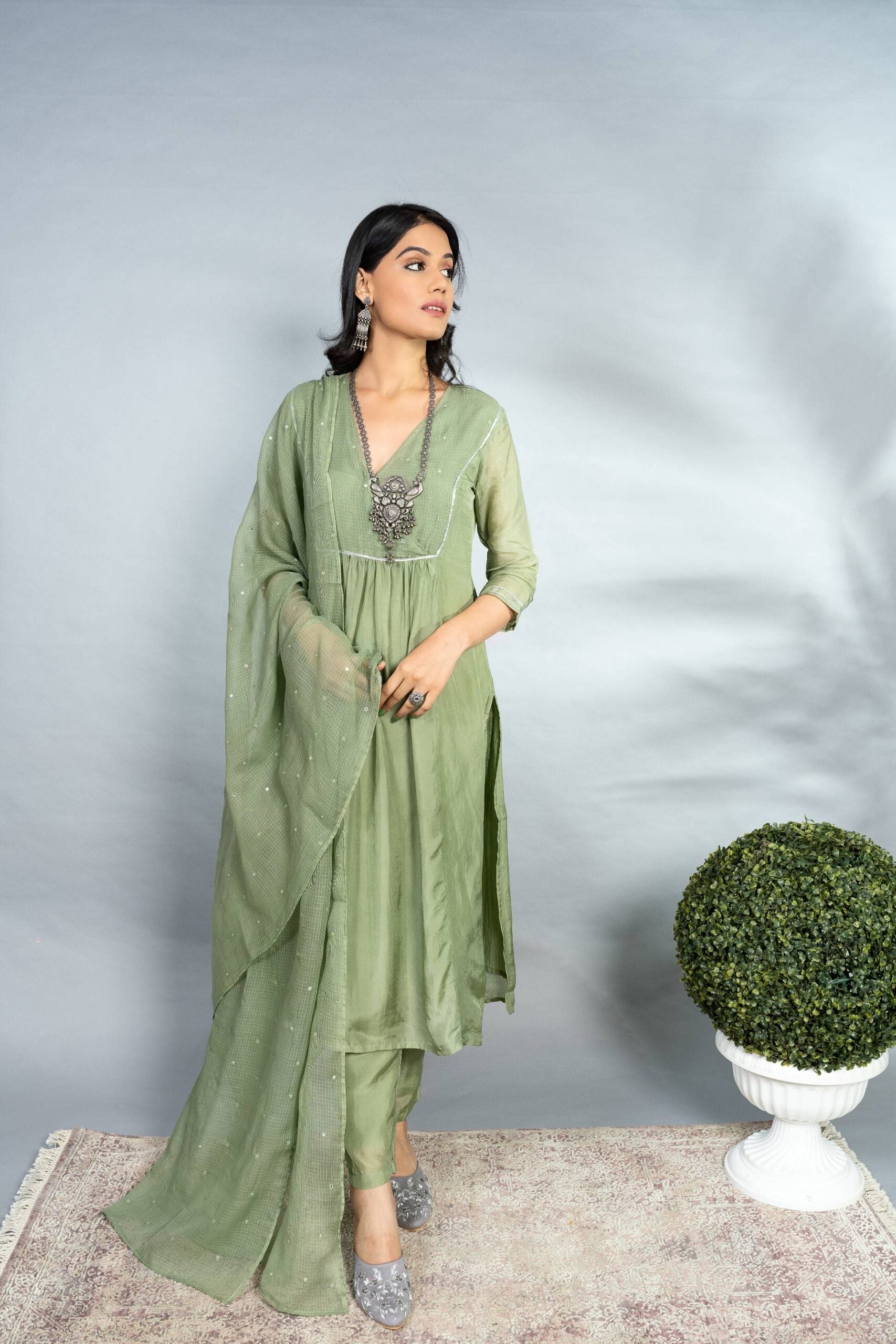 DULL GREEN SATIN SILK KALI TUNIC WITH PANT SET. IT COMES WITH A COTTON DORIYA DUPATTA AND YOKE WITH PATRA HANDWORK AND GOTA DETAILS
