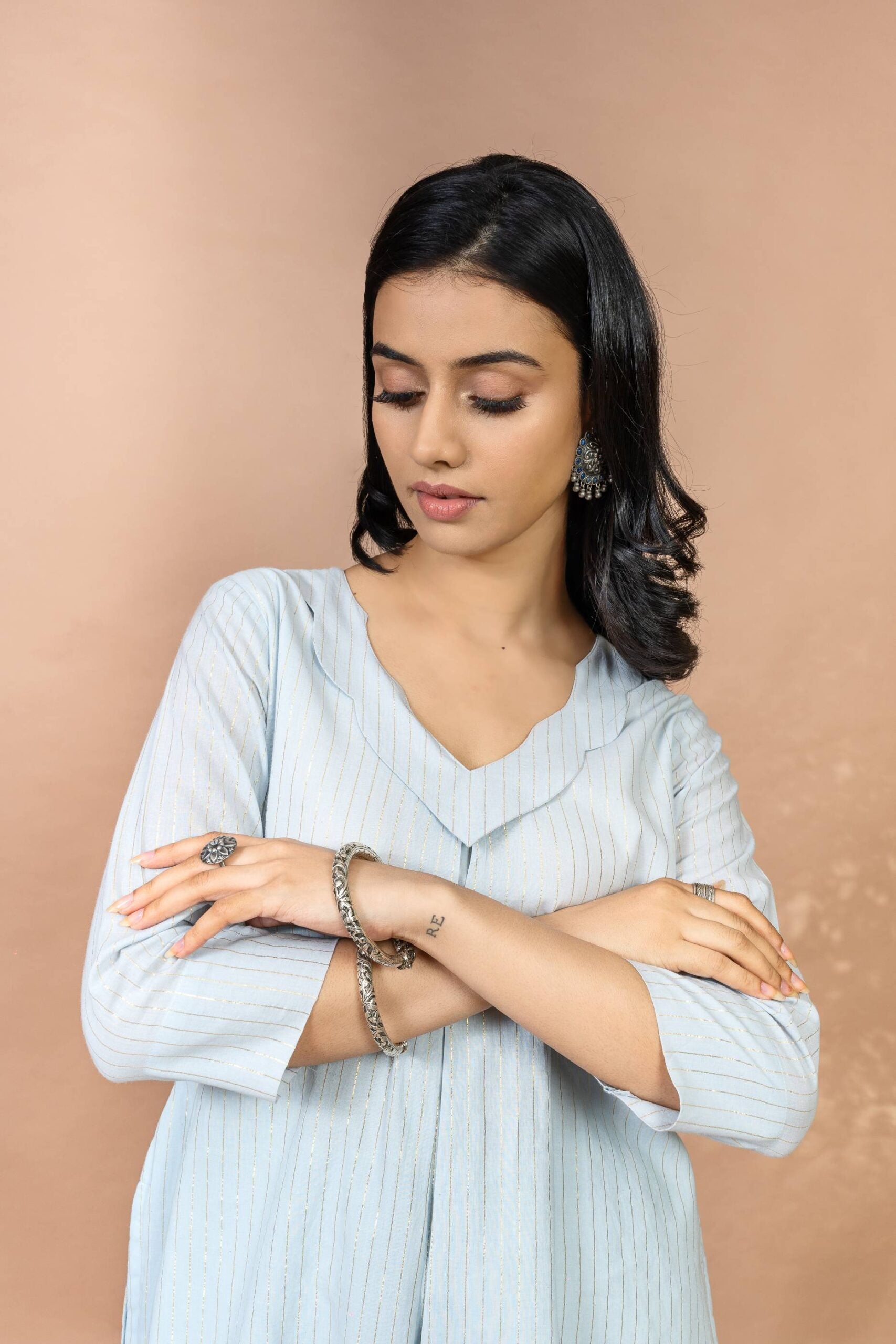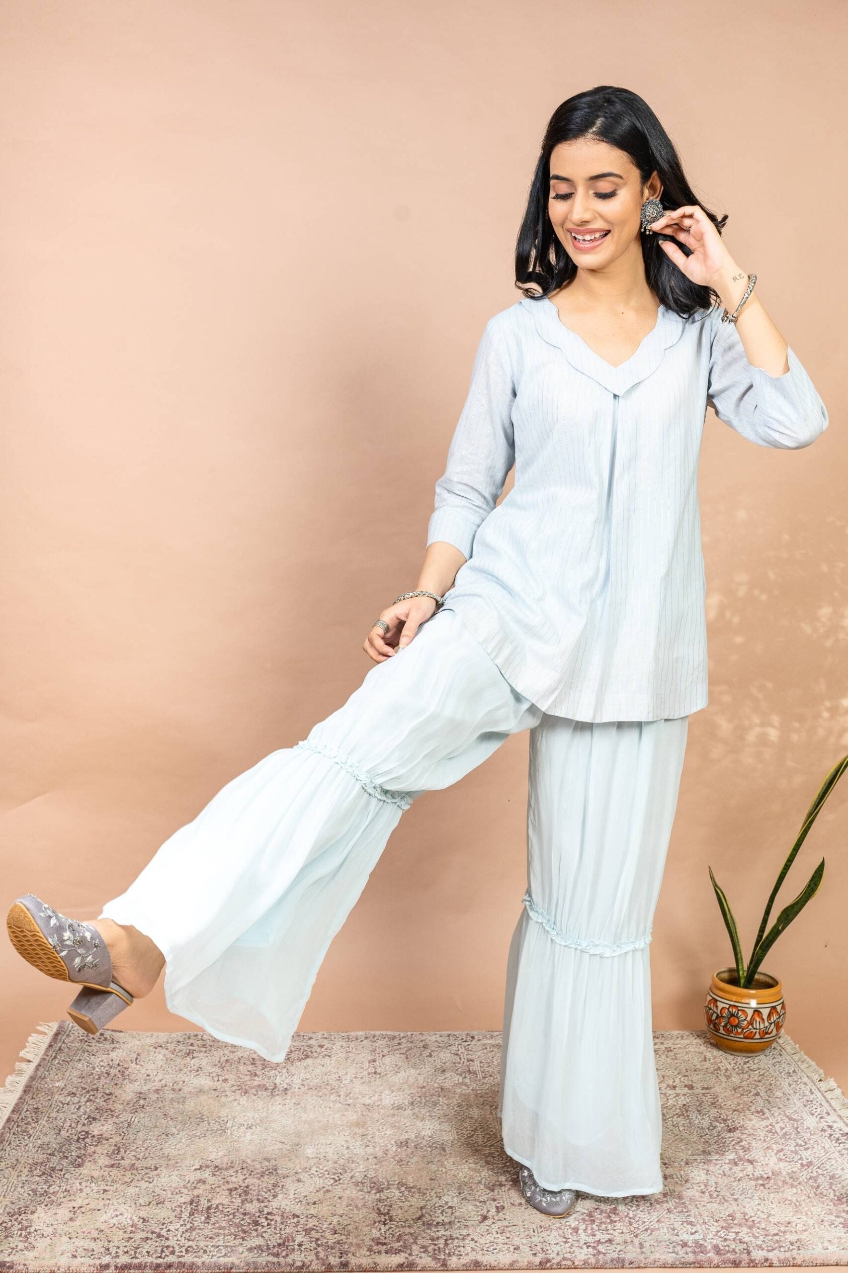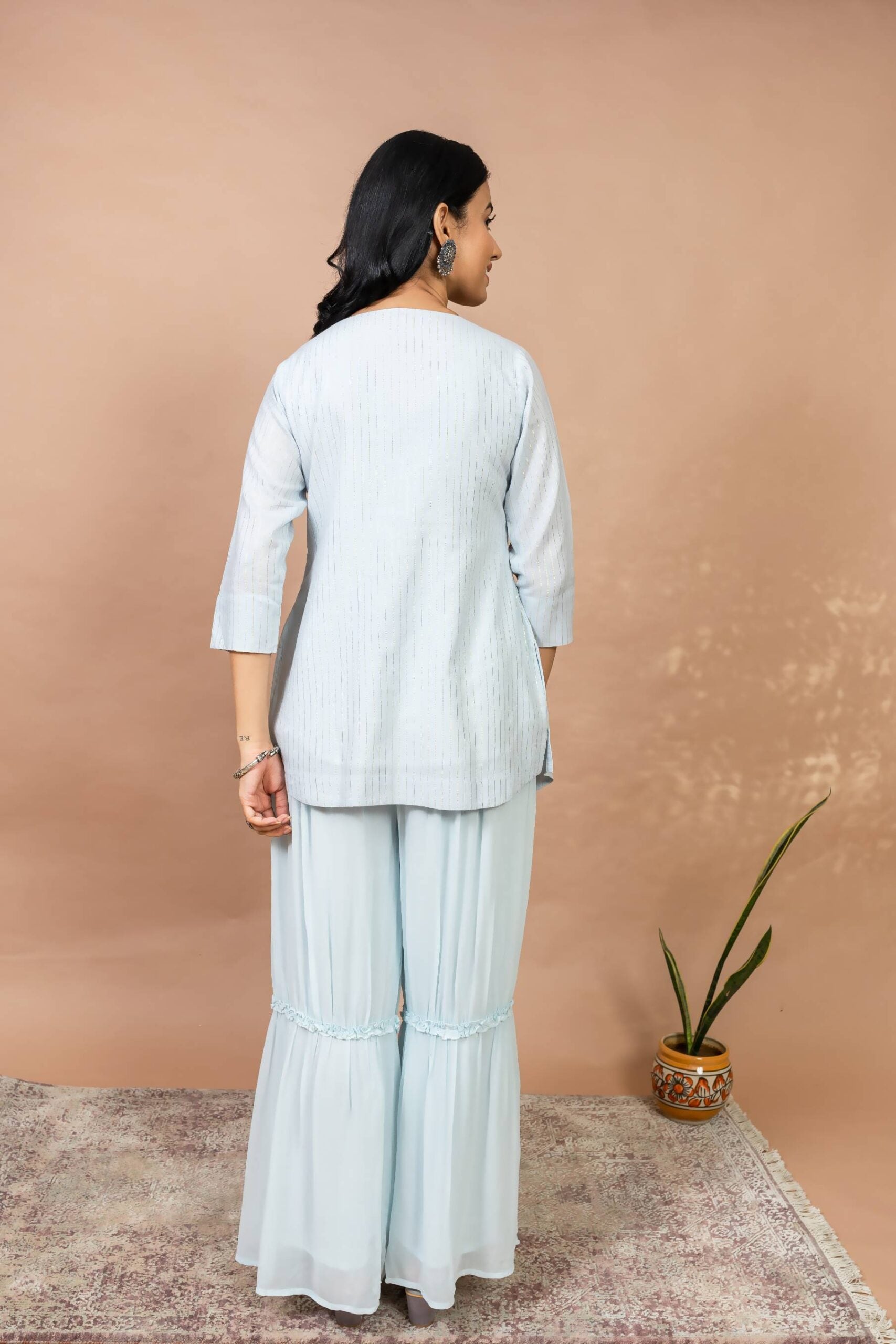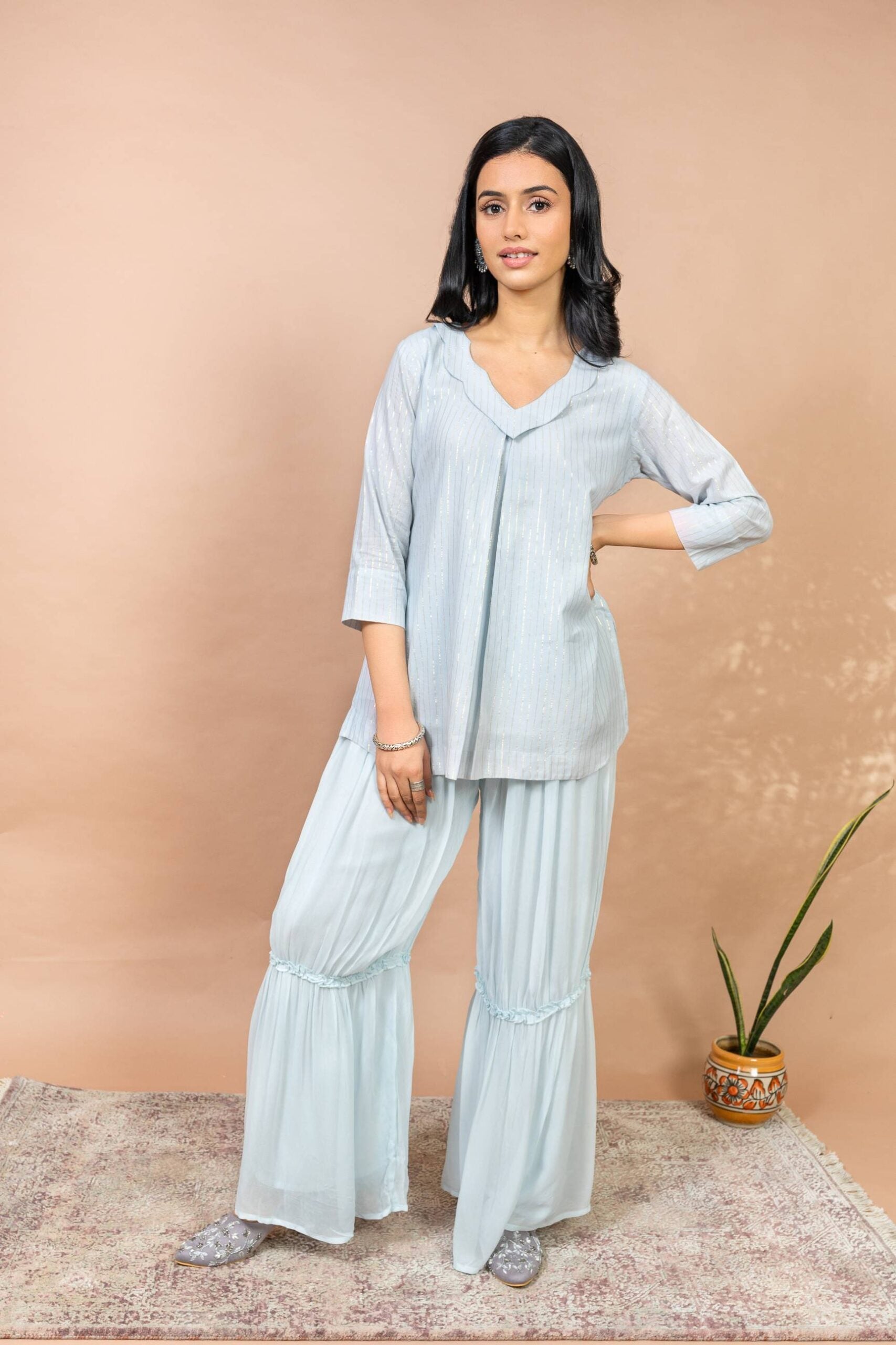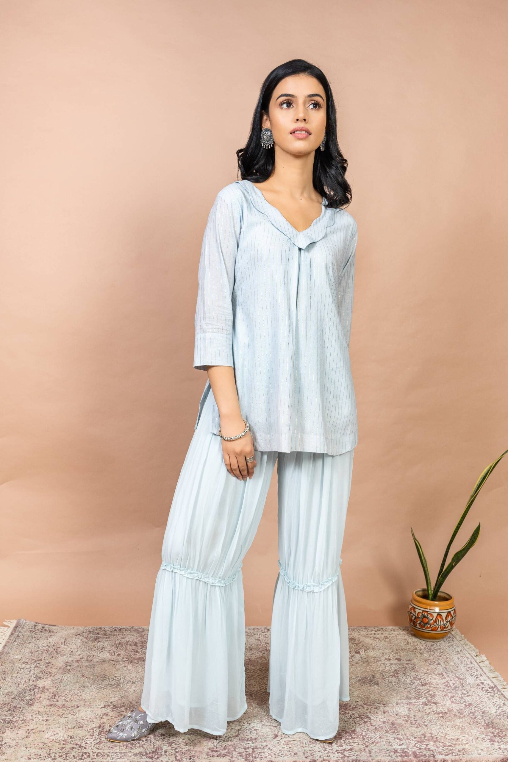 ICE BLUE COTTON LUREX TOP WITH FLAP COLLAR PAIRED UP WITH GEORGETTE GATHER FLARE PANTS.