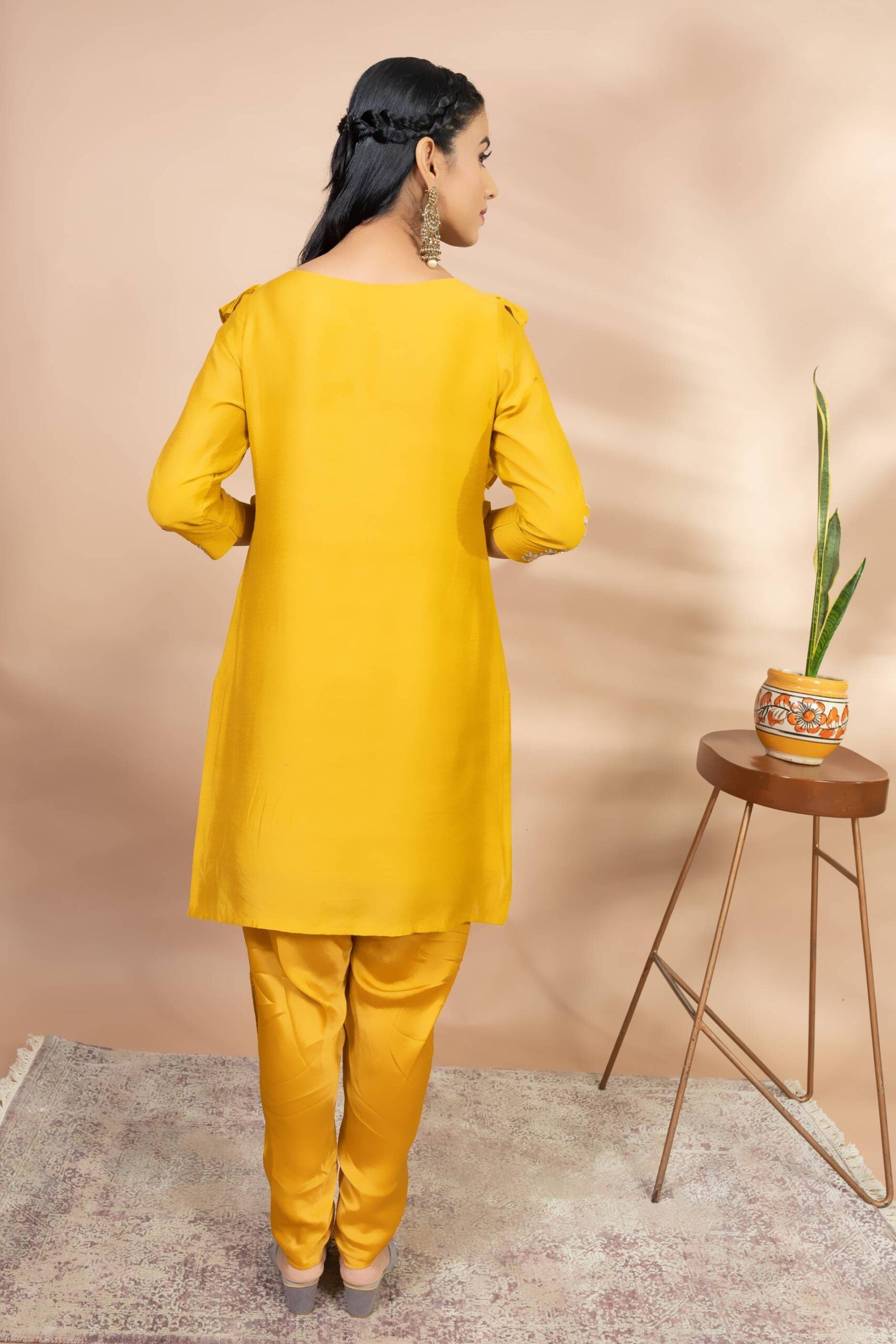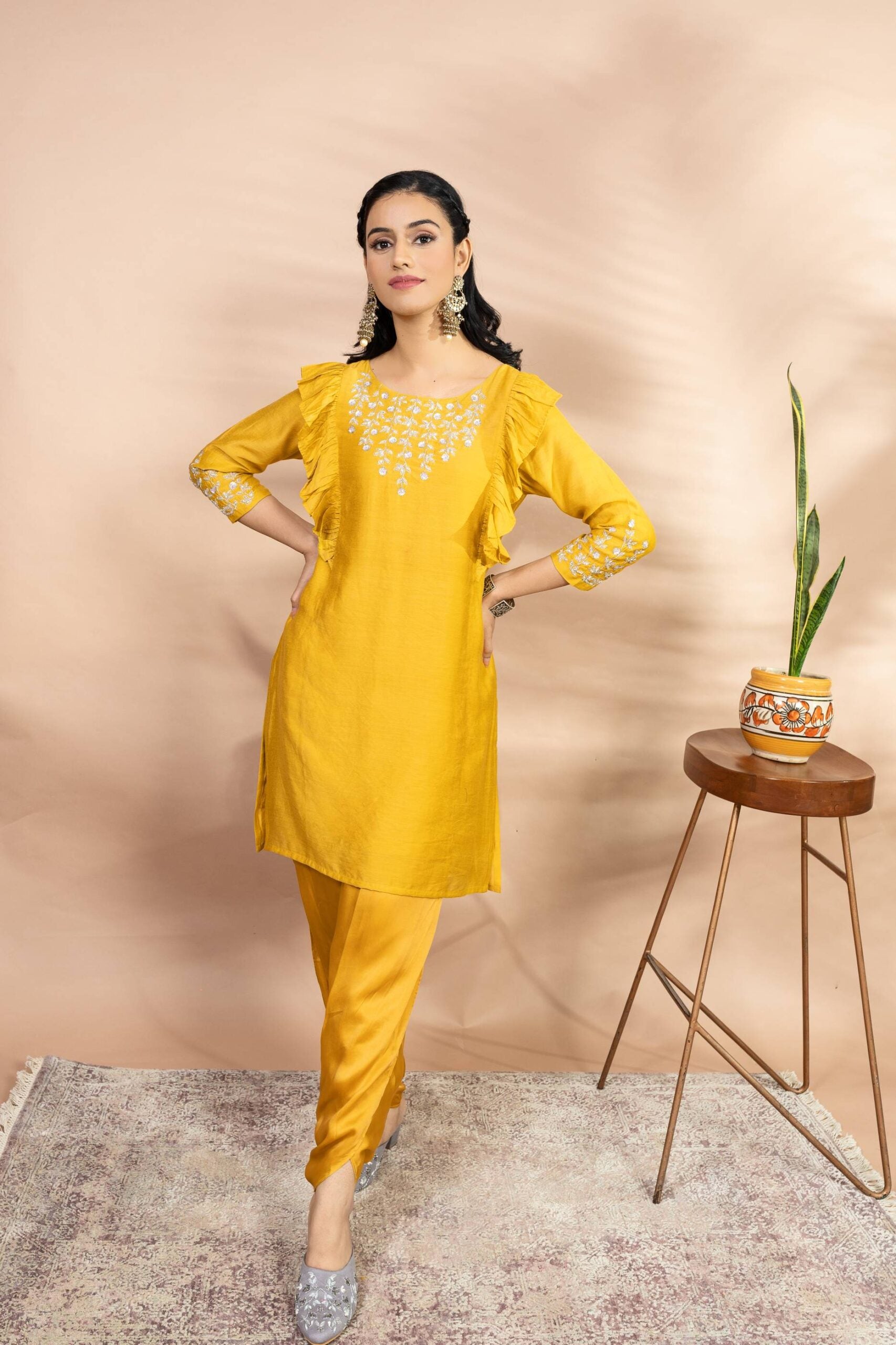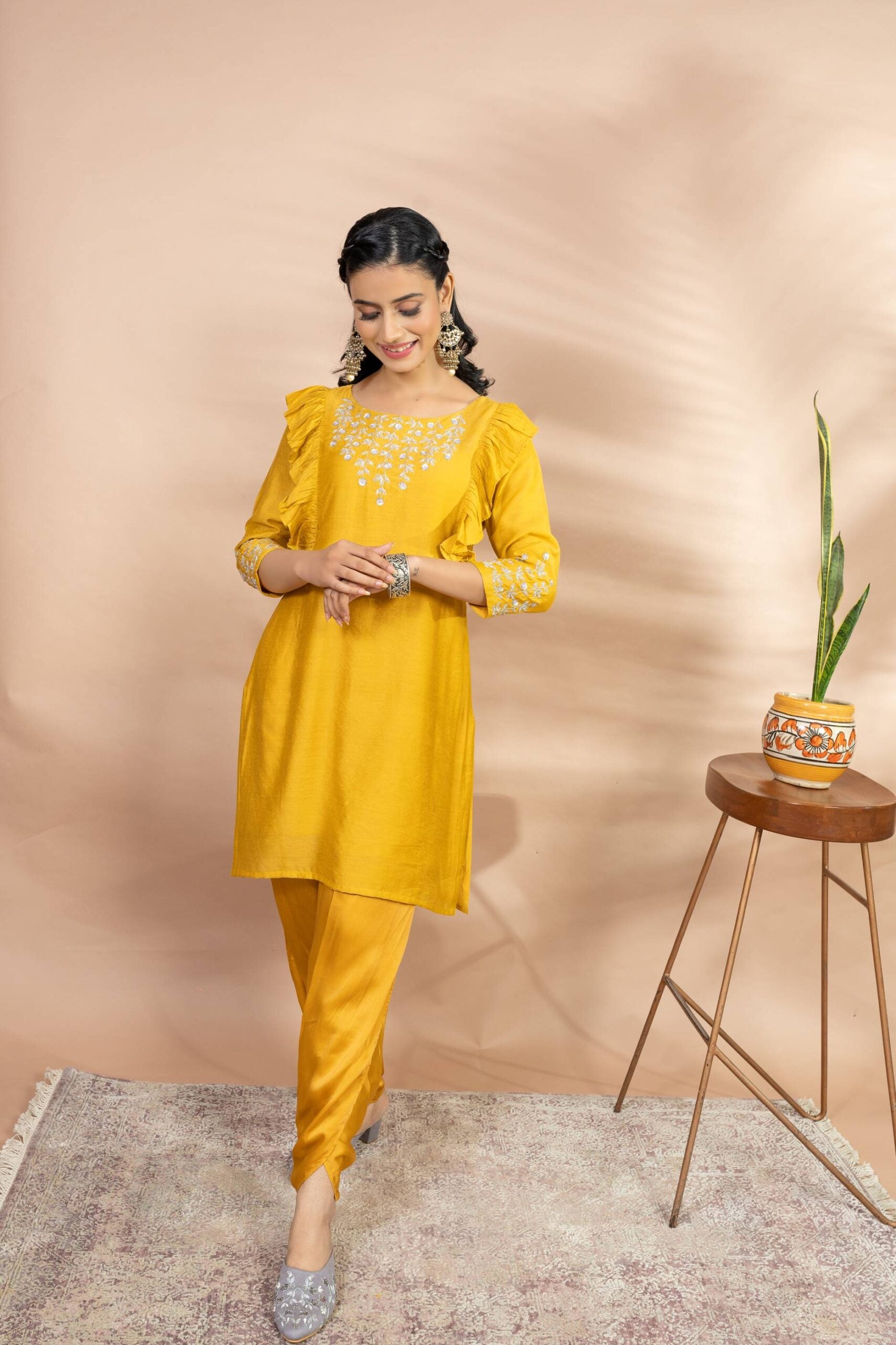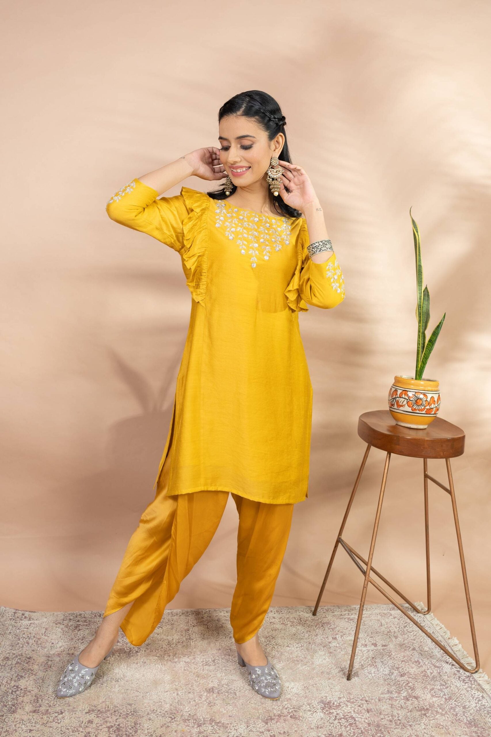 HAPPY MUSTARD CHANDERI SHORT TUNIC WITH FRILL DETAILS AND KATDANA HANDWORK ON NECK AND SLEEVES PAIRED WITH BAMBERG SATIN DHOTI