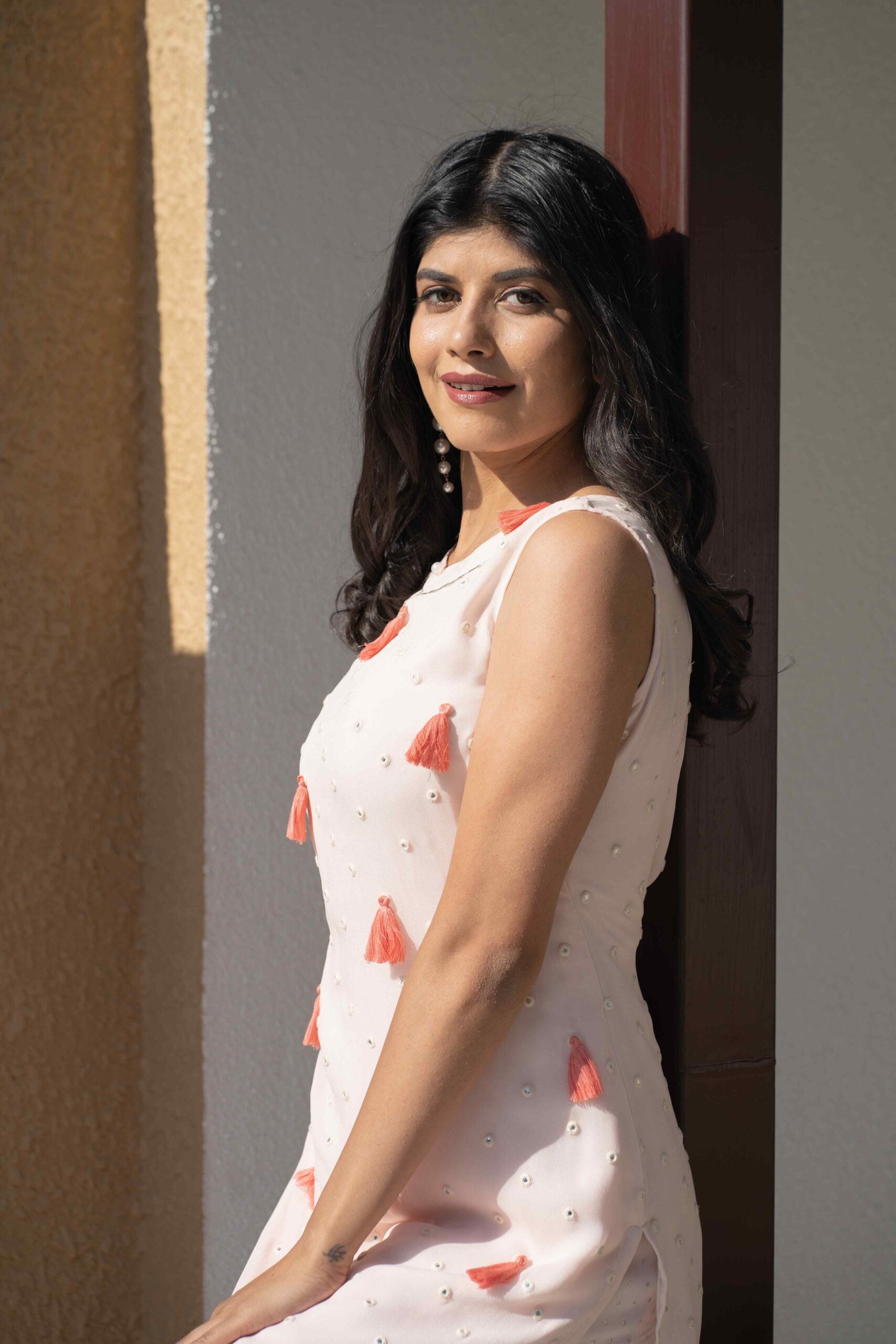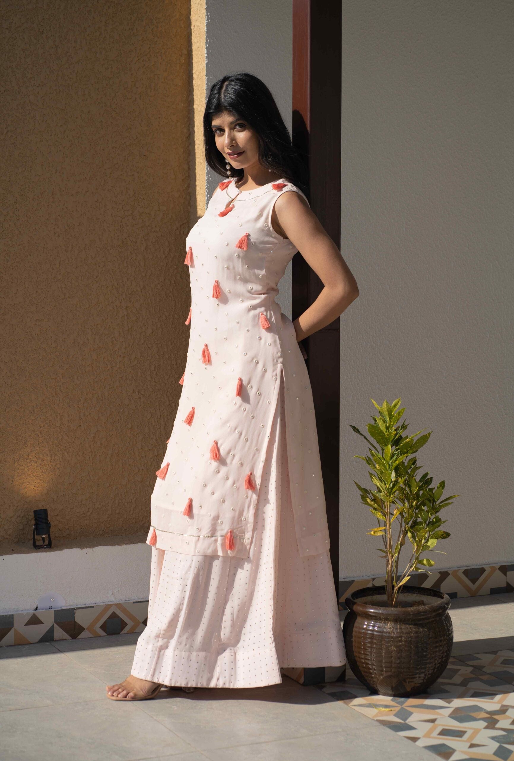 SELF MIRROR WORK GEORGETTE TUNIC WITH HANDMADE TASSELS AND GOTA DETAILS PAIRED WITH SELF CHINON MUKAISH WORK KALI PALLAZO