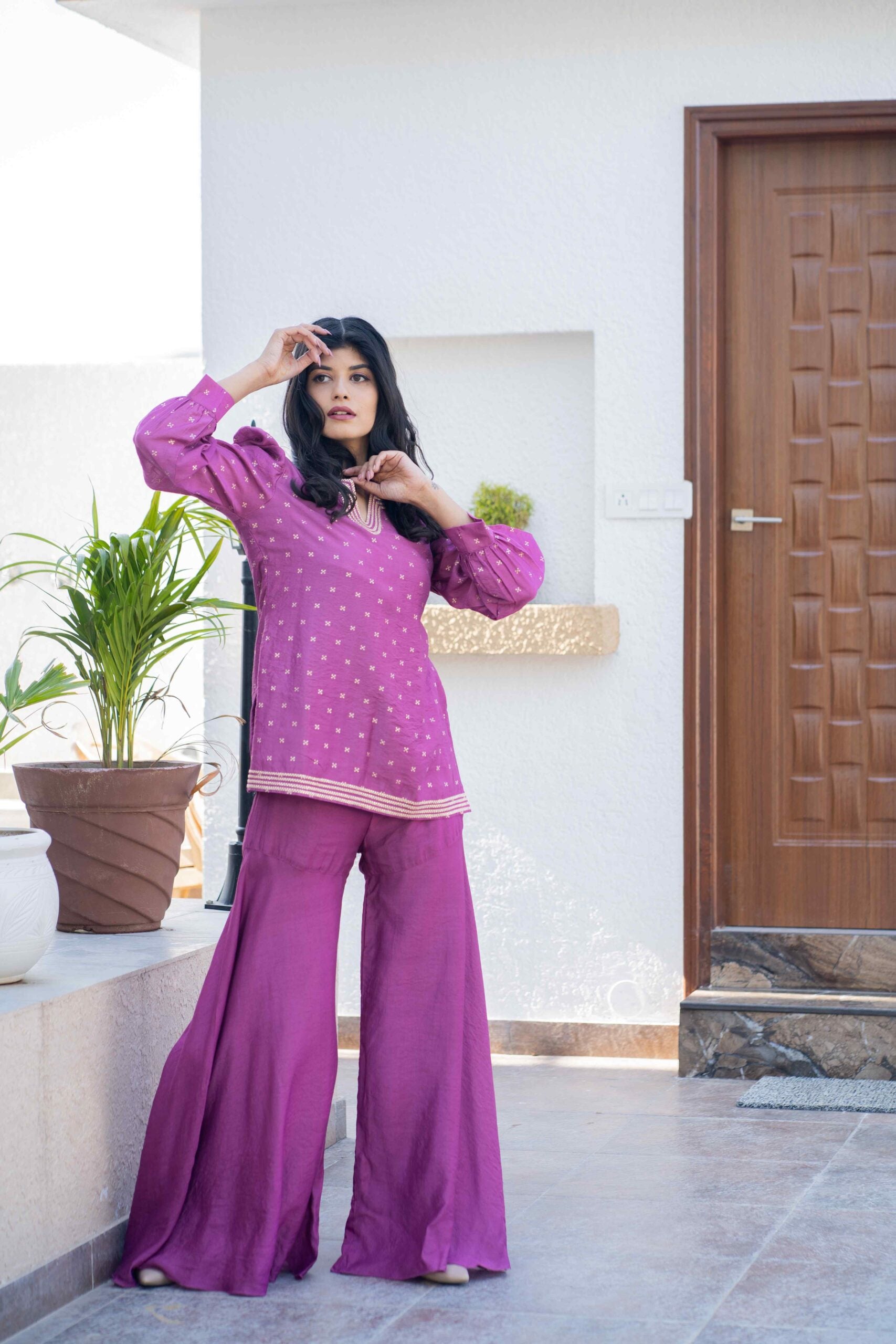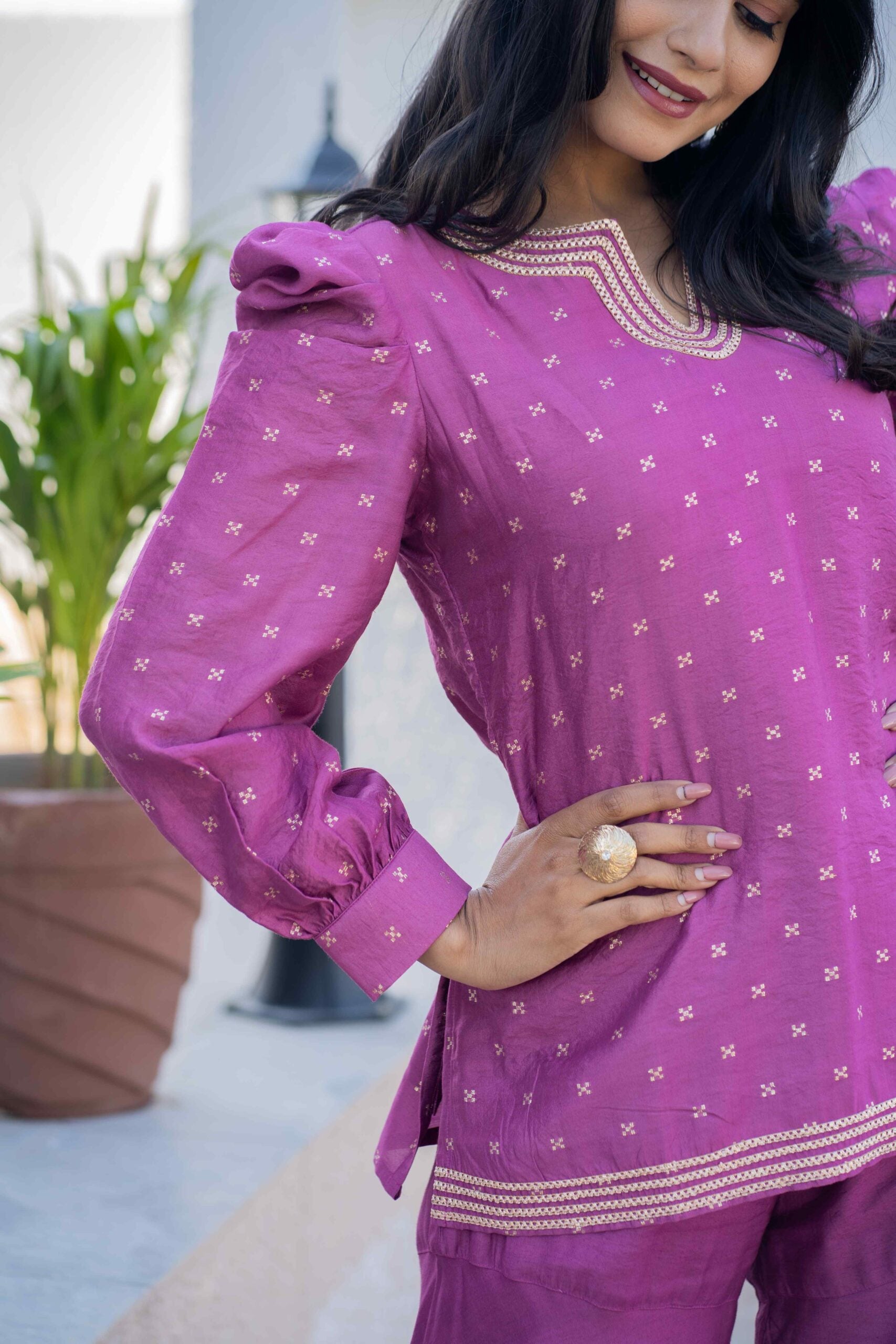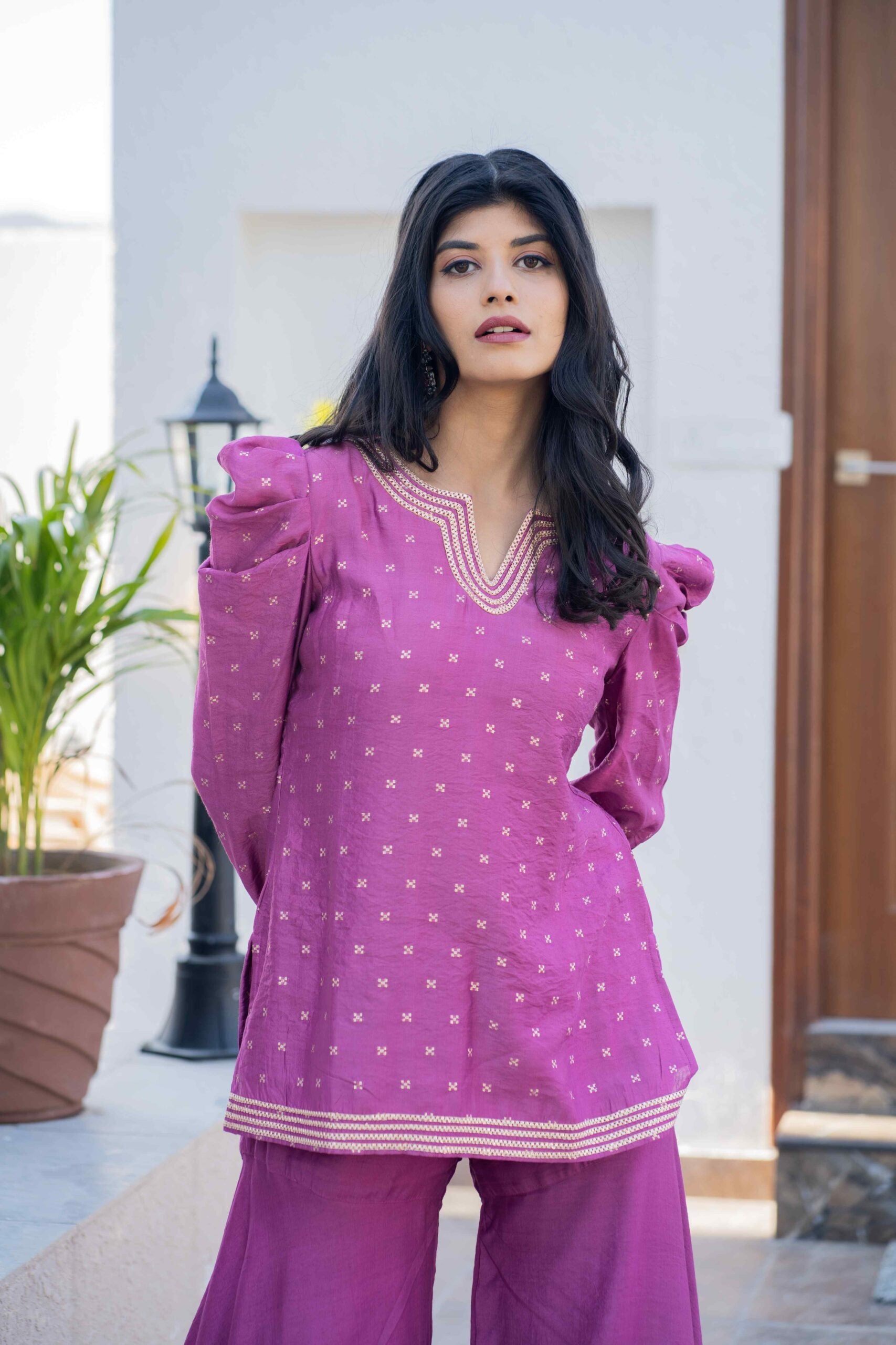 SELF ZARI BOOTA CHANDERI PUFF SLEEVES TUNIC WITH LACE DETAILS PAIRED WITH CHANDERI GARARA