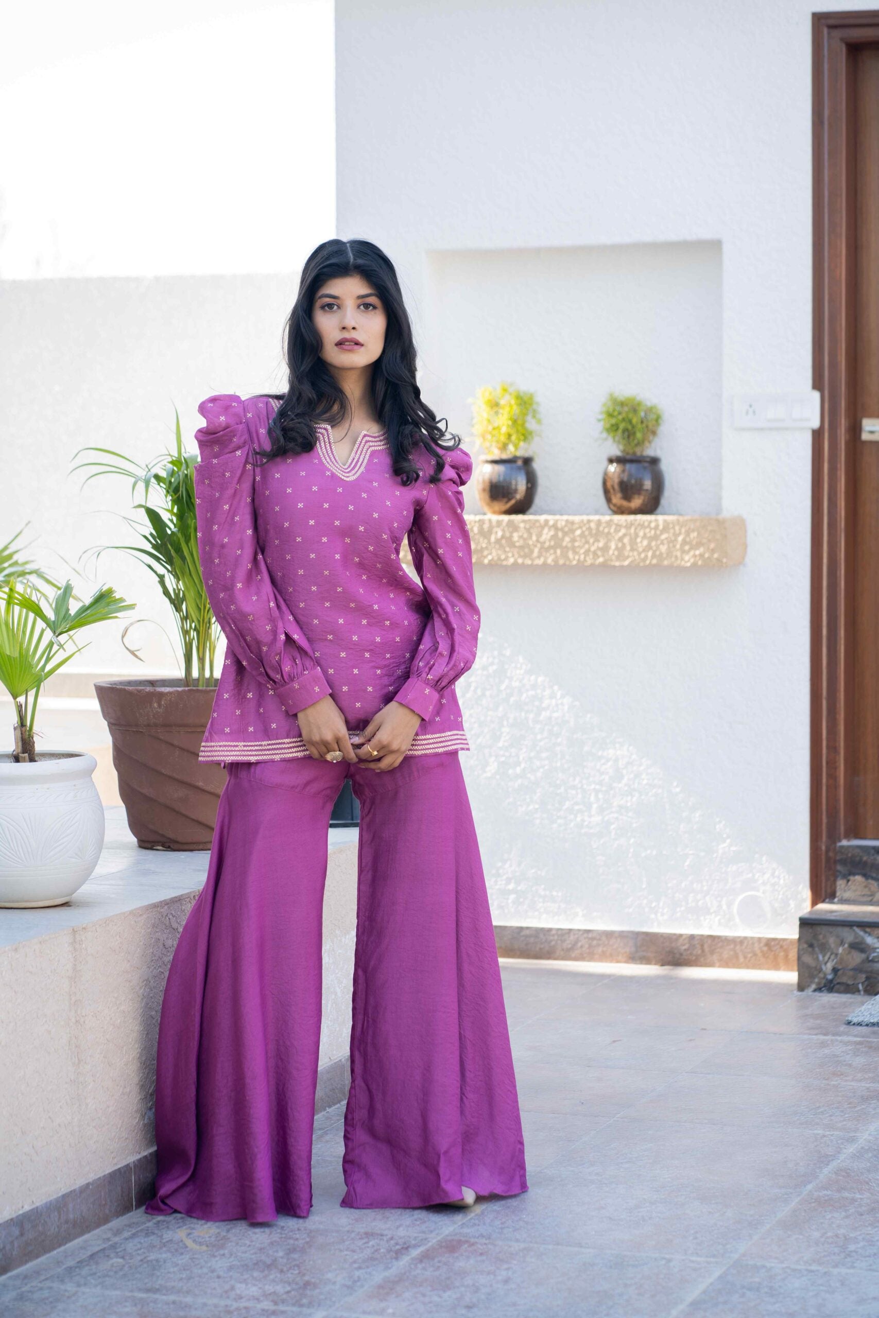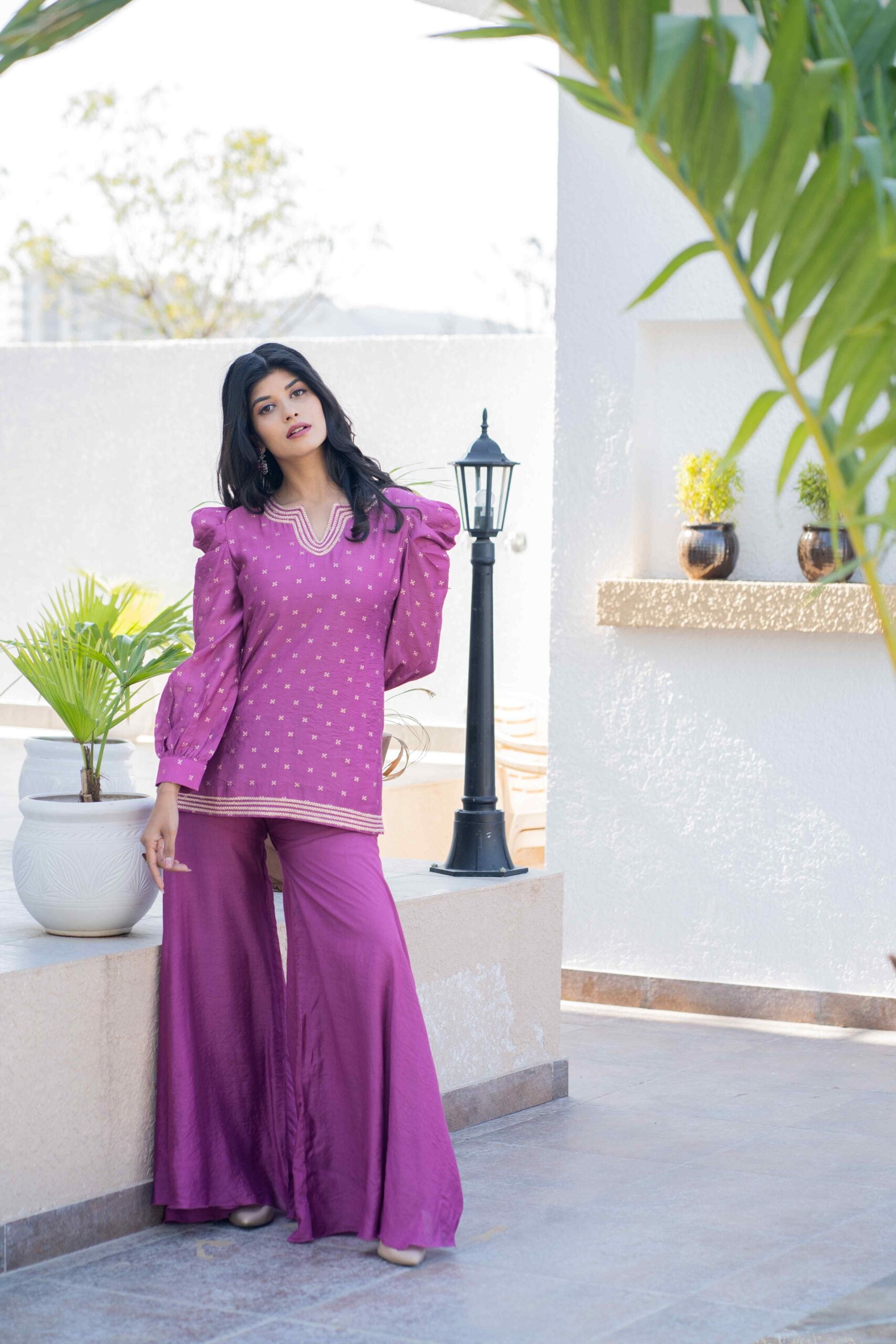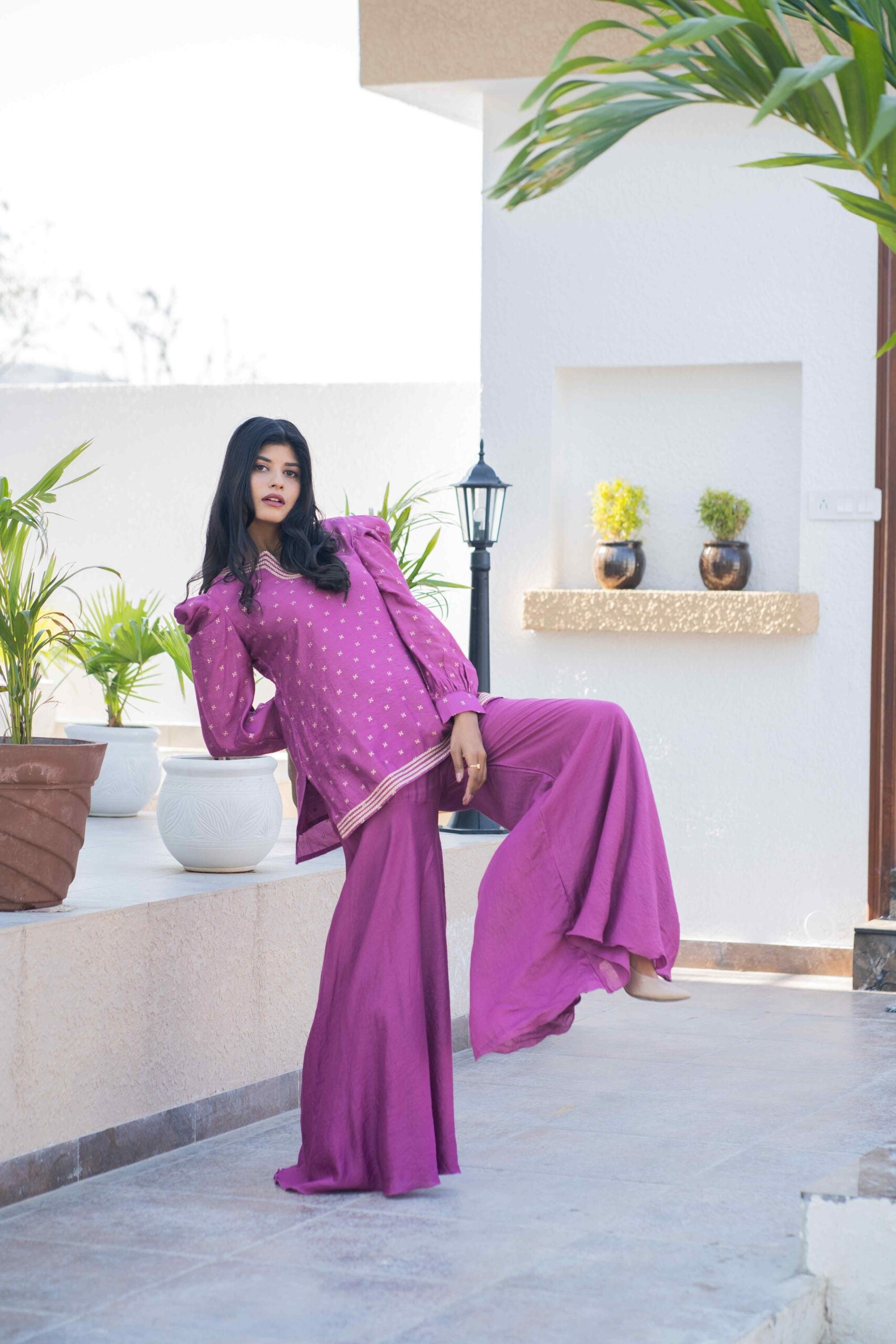 SELF ZARI BOOTA CHANDERI PUFF SLEEVES TUNIC WITH LACE DETAILS PAIRED WITH CHANDERI GARARA
